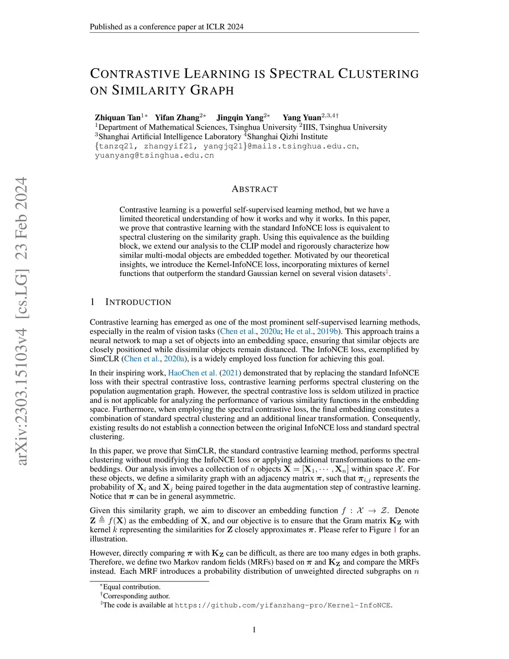 Contrastive learning is a powerful self-supervised learning method, but we have a limited theoretical understanding of how it works and why it works. In this paper, we prove that contrastive learning with the standard InfoNCE loss is equivalent to spectral clustering on the similarity graph. Using this equivalence as the building block, we extend our analysis to the CLIP model and rigorously characterize how similar multi-modal objects are embedded together. Motivated by our theoretical insights, we introduce the Kernel-InfoNCE loss, incorporating mixtures of kernel functions that outperform the standard Gaussian kernel on several vision datasets. The code is available at https://github.com/yifanzhang-pro/Kernel-InfoNCE.