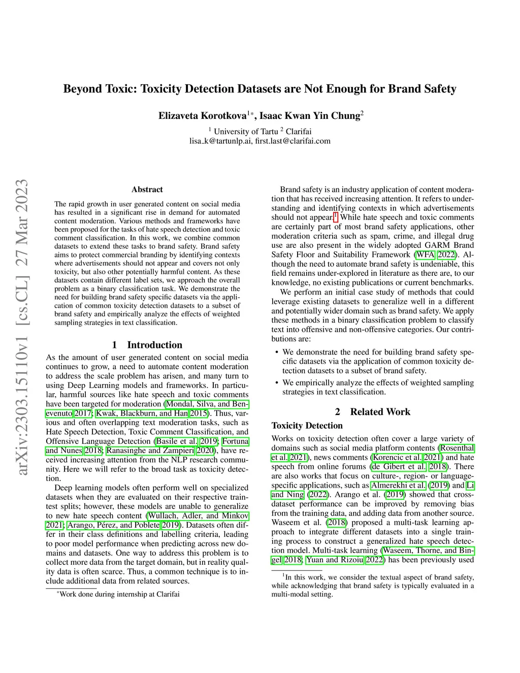 The rapid growth in user generated content on social media has resulted in a significant rise in demand for automated content moderation. Various methods and frameworks have been proposed for the tasks of hate speech detection and toxic comment classification. In this work, we combine common datasets to extend these tasks to brand safety. Brand safety aims to protect commercial branding by identifying contexts where advertisements should not appear and covers not only toxicity, but also other potentially harmful content. As these datasets contain different label sets, we approach the overall problem as a binary classification task. We demonstrate the need for building brand safety specific datasets via the application of common toxicity detection datasets to a subset of brand safety and empirically analyze the effects of weighted sampling strategies in text classification.