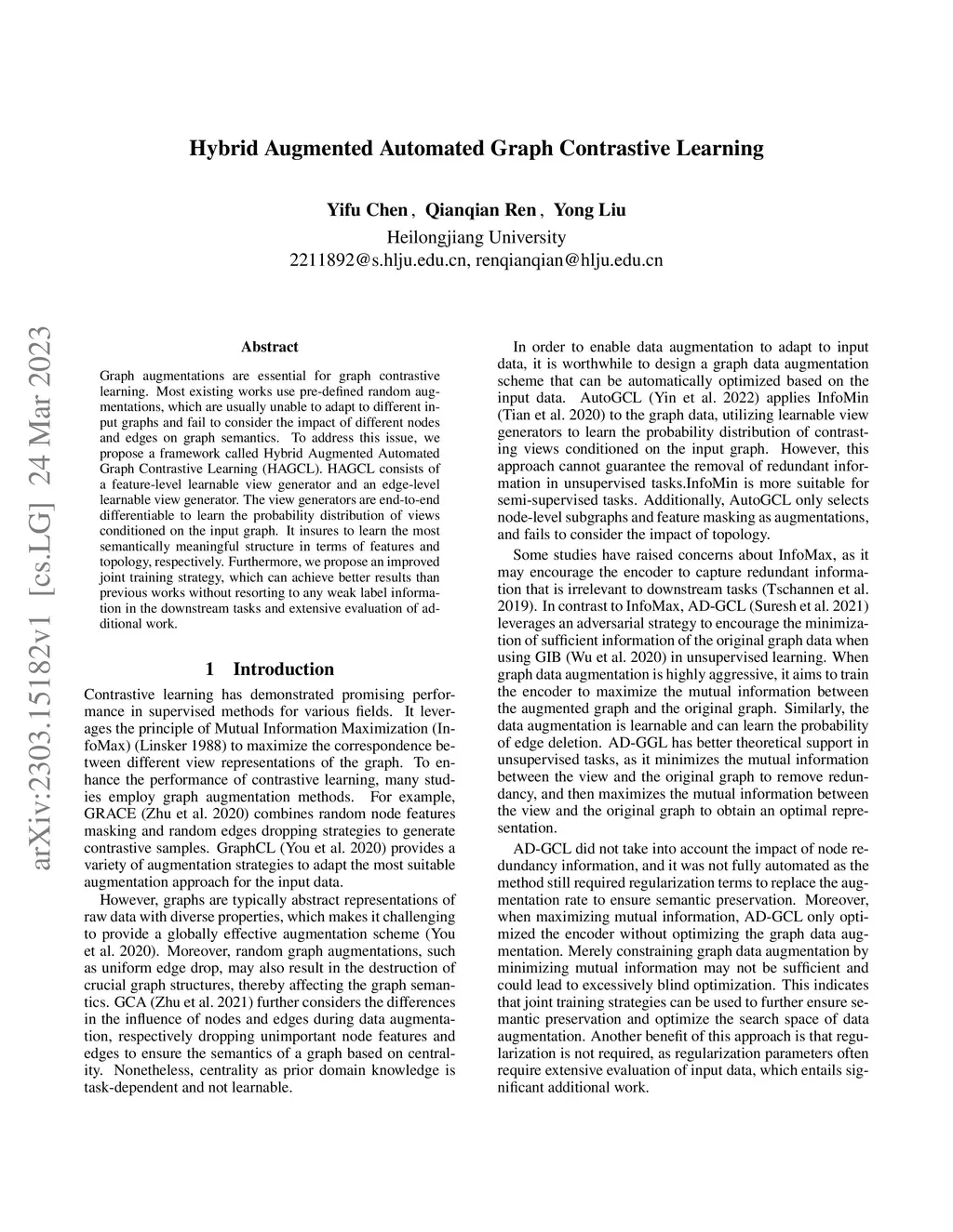 Graph augmentations are essential for graph contrastive learning. Most existing works use pre-defined random augmentations, which are usually unable to adapt to different input graphs and fail to consider the impact of different nodes and edges on graph semantics. To address this issue, we propose a framework called Hybrid Augmented Automated Graph Contrastive Learning (HAGCL). HAGCL consists of a feature-level learnable view generator and an edge-level learnable view generator. The view generators are end-to-end differentiable to learn the probability distribution of views conditioned on the input graph. It insures to learn the most semantically meaningful structure in terms of features and topology, respectively. Furthermore, we propose an improved joint training strategy, which can achieve better results than previous works without resorting to any weak label information in the downstream tasks and extensive evaluation of additional work.