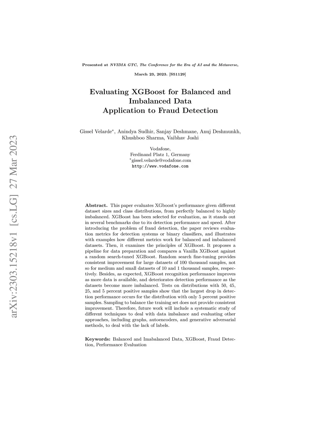 This paper evaluates XGboost's performance given different dataset sizes and class distributions, from perfectly balanced to highly imbalanced. XGBoost has been selected for evaluation, as it stands out in several benchmarks due to its detection performance and speed. After introducing the problem of fraud detection, the paper reviews evaluation metrics for detection systems or binary classifiers, and illustrates with examples how different metrics work for balanced and imbalanced datasets. Then, it examines the principles of XGBoost. It proposes a pipeline for data preparation and compares a Vanilla XGBoost against a random search-tuned XGBoost. Random search fine-tuning provides consistent improvement for large datasets of 100 thousand samples, not so for medium and small datasets of 10 and 1 thousand samples, respectively. Besides, as expected, XGBoost recognition performance improves as more data is available, and deteriorates detection performance as the datasets become more imbalanced. Tests on distributions with 50, 45, 25, and 5 percent positive samples show that the largest drop in detection performance occurs for the distribution with only 5 percent positive samples. Sampling to balance the training set does not provide consistent improvement. Therefore, future work will include a systematic study of different techniques to deal with data imbalance and evaluating other approaches, including graphs, autoencoders, and generative adversarial methods, to deal with the lack of labels.