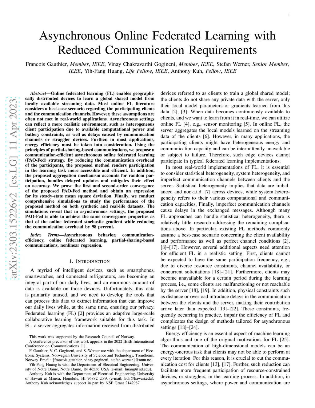 Online federated learning (FL) enables geographically distributed devices to learn a global shared model from locally available streaming data. Most online FL literature considers a best-case scenario regarding the participating clients and the communication channels. However, these assumptions are often not met in real-world applications. Asynchronous settings can reflect a more realistic environment, such as heterogeneous client participation due to available computational power and battery constraints, as well as delays caused by communication channels or straggler devices. Further, in most applications, energy efficiency must be taken into consideration. Using the principles of partial-sharing-based communications, we propose a communication-efficient asynchronous online federated learning (PAO-Fed) strategy. By reducing the communication overhead of the participants, the proposed method renders participation in the learning task more accessible and efficient. In addition, the proposed aggregation mechanism accounts for random participation, handles delayed updates and mitigates their effect on accuracy. We prove the first and second-order convergence of the proposed PAO-Fed method and obtain an expression for its steady-state mean square deviation. Finally, we conduct comprehensive simulations to study the performance of the proposed method on both synthetic and real-life datasets. The simulations reveal that in asynchronous settings, the proposed PAO-Fed is able to achieve the same convergence properties as that of the online federated stochastic gradient while reducing the communication overhead by 98 percent.