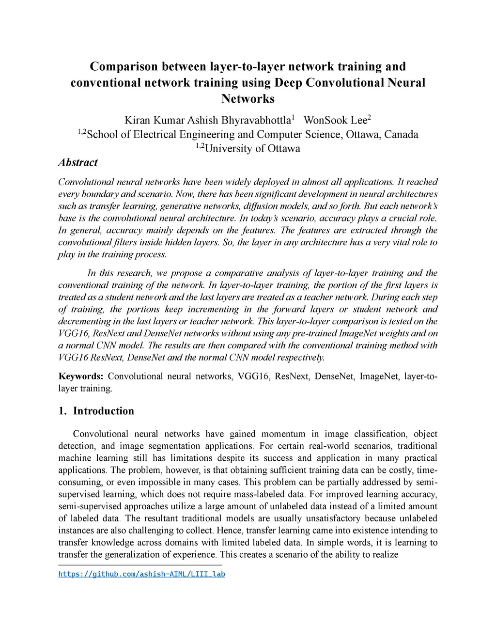 Title: Comparison between layer-to-layer network training and conventional network training using Convolutional Neural Networks Abstract: Convolutional neural networks (CNNs) are widely used in various applications due to their effectiveness in extracting features from data. However, the performance of a CNN heavily depends on its architecture and training process. In this study, we propose a layer-to-layer training method and compare its performance with the conventional training method. In the layer-to-layer training approach, we treat a portion of the early layers as a student network and the later layers as a teacher network. During each training step, we incrementally train the student network to learn from the output of the teacher network, and vice versa. We evaluate this approach on a VGG16 network without pre-trained ImageNet weights and a regular CNN model. Our experiments show that the layer-to-layer training method outperforms the conventional training method for both models. Specifically, we achieve higher accuracy on the test set for the VGG16 network and the CNN model using layer-to-layer training compared to the conventional training method. Overall, our study highlights the importance of layer-wise training in CNNs and suggests that layer-to-layer training can be a promising approach for improving the accuracy of CNNs.