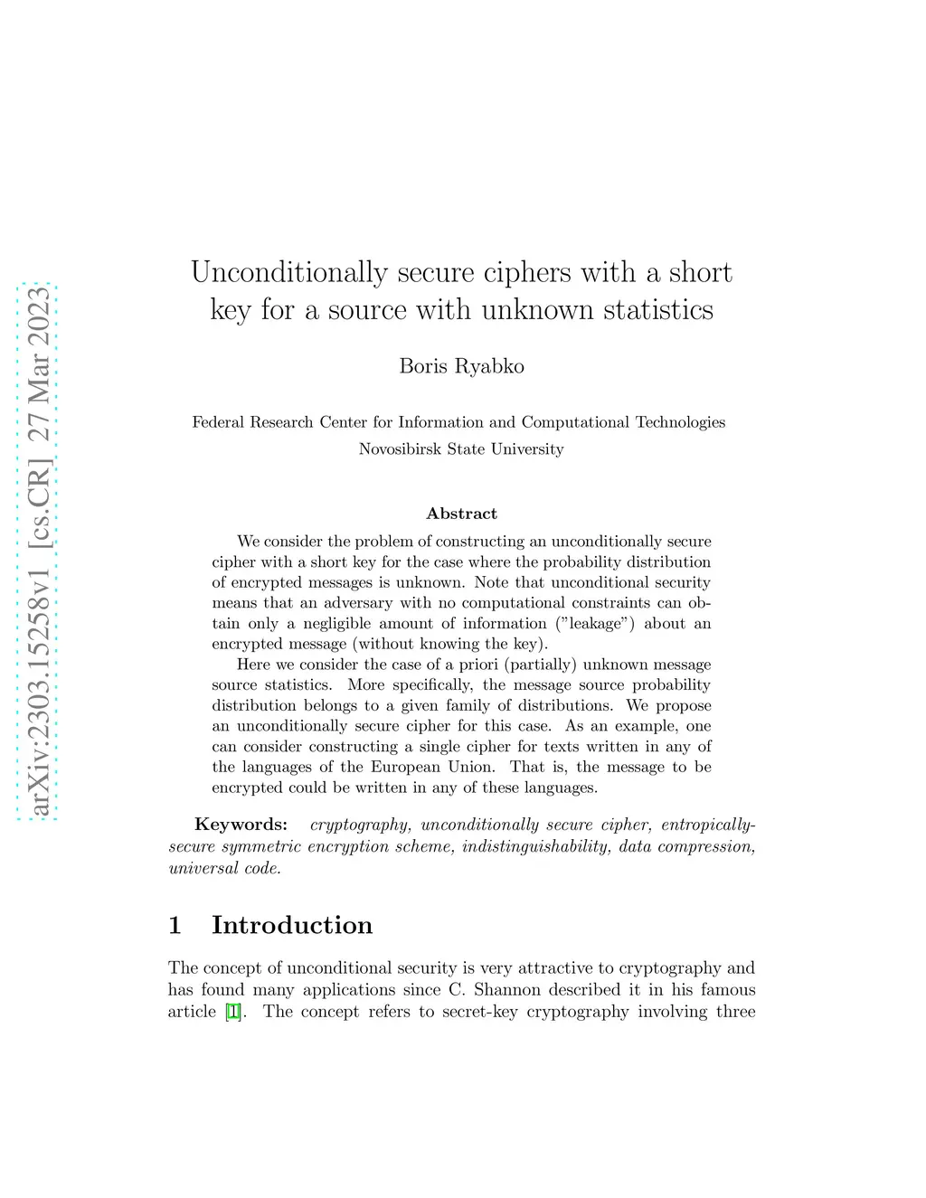 We consider the problem of constructing an unconditionally secure cipher with a short key for the case where the probability distribution of encrypted messages is unknown. Note that unconditional security means that an adversary with no computational constraints can obtain only a negligible amount of information ("leakage") about an encrypted message (without knowing the key). Here we consider the case of a priori (partially) unknown message source statistics. More specifically, the message source probability distribution belongs to a given family of distributions. We propose an unconditionally secure cipher for this case. As an example, one can consider constructing a single cipher for texts written in any of the languages of the European Union. That is, the message to be encrypted could be written in any of these languages.