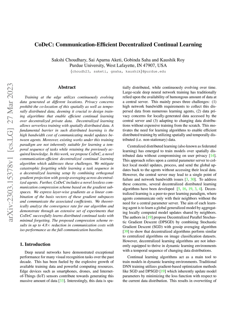 Training at the edge utilizes continuously evolving data generated at different locations. Privacy concerns prohibit the co-location of this spatially as well as temporally distributed data, deeming it crucial to design training algorithms that enable efficient continual learning over decentralized private data. Decentralized learning allows serverless training with spatially distributed data. A fundamental barrier in such distributed learning is the high bandwidth cost of communicating model updates between agents. Moreover, existing works under this training paradigm are not inherently suitable for learning a temporal sequence of tasks while retaining the previously acquired knowledge. In this work, we propose CoDeC, a novel communication-efficient decentralized continual learning algorithm which addresses these challenges. We mitigate catastrophic forgetting while learning a task sequence in a decentralized learning setup by combining orthogonal gradient projection with gossip averaging across decentralized agents. Further, CoDeC includes a novel lossless communication compression scheme based on the gradient subspaces. We express layer-wise gradients as a linear combination of the basis vectors of these gradient subspaces and communicate the associated coefficients. We theoretically analyze the convergence rate for our algorithm and demonstrate through an extensive set of experiments that CoDeC successfully learns distributed continual tasks with minimal forgetting. The proposed compression scheme results in up to 4.8x reduction in communication costs with iso-performance as the full communication baseline.