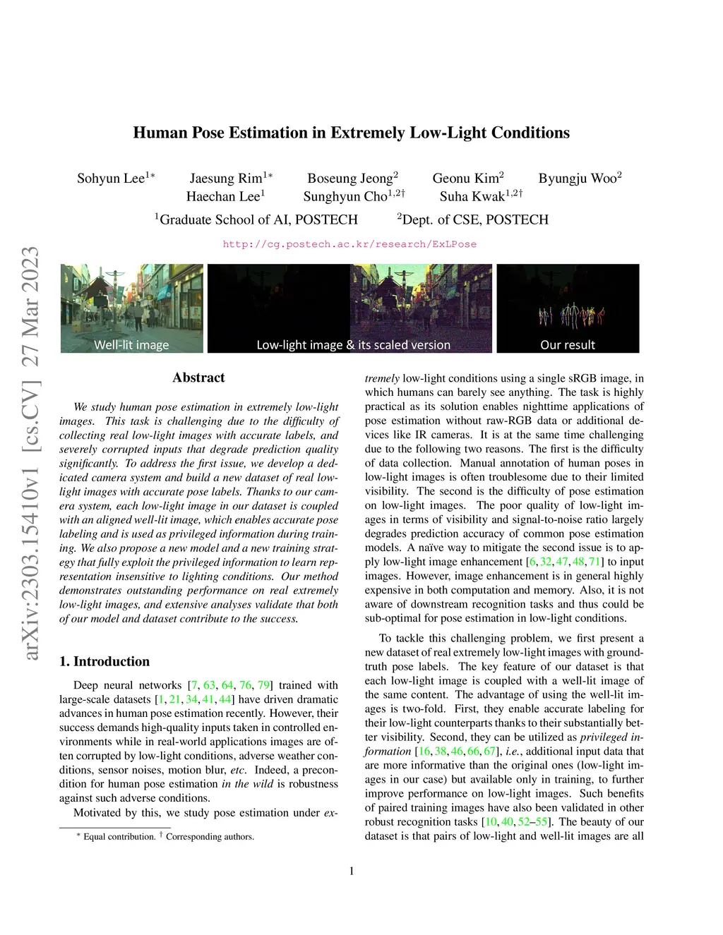 We study human pose estimation in extremely low-light images. This task is challenging due to the difficulty of collecting real low-light images with accurate labels, and severely corrupted inputs that degrade prediction quality significantly. To address the first issue, we develop a dedicated camera system and build a new dataset of real low-light images with accurate pose labels. Thanks to our camera system, each low-light image in our dataset is coupled with an aligned well-lit image, which enables accurate pose labeling and is used as privileged information during training. We also propose a new model and a new training strategy that fully exploit the privileged information to learn representation insensitive to lighting conditions. Our method demonstrates outstanding performance on real extremely low light images, and extensive analyses validate that both of our model and dataset contribute to the success.