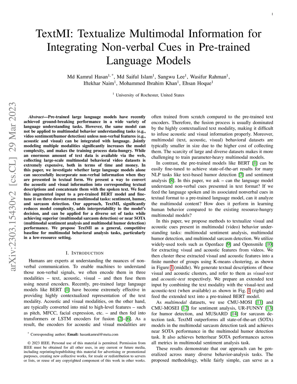 Pre-trained large language models have recently achieved ground-breaking performance in a wide variety of language understanding tasks. However, the same model can not be applied to multimodal behavior understanding tasks (e.g., video sentiment/humor detection) unless non-verbal features (e.g., acoustic and visual) can be integrated with language. Jointly modeling multiple modalities significantly increases the model complexity, and makes the training process data-hungry. While an enormous amount of text data is available via the web, collecting large-scale multimodal behavioral video datasets is extremely expensive, both in terms of time and money. In this paper, we investigate whether large language models alone can successfully incorporate non-verbal information when they are presented in textual form. We present a way to convert the acoustic and visual information into corresponding textual descriptions and concatenate them with the spoken text. We feed this augmented input to a pre-trained BERT model and fine-tune it on three downstream multimodal tasks: sentiment, humor, and sarcasm detection. Our approach, TextMI, significantly reduces model complexity, adds interpretability to the model's decision, and can be applied for a diverse set of tasks while achieving superior (multimodal sarcasm detection) or near SOTA (multimodal sentiment analysis and multimodal humor detection) performance. We propose TextMI as a general, competitive baseline for multimodal behavioral analysis tasks, particularly in a low-resource setting.