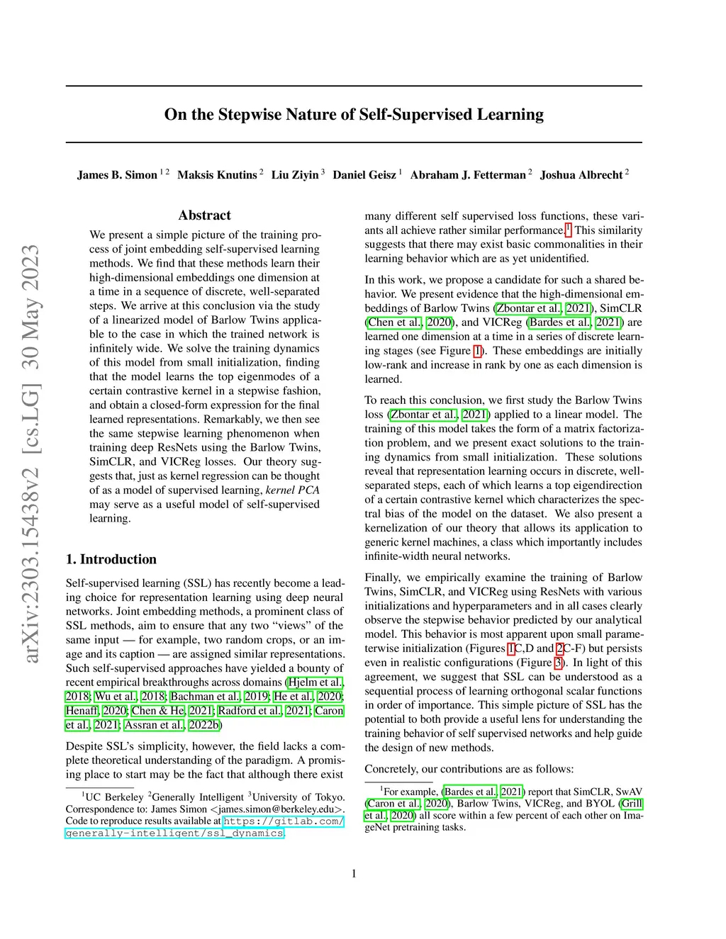We present a simple picture of the training process of joint embedding self-supervised learning methods. We find that these methods learn their high-dimensional embeddings one dimension at a time in a sequence of discrete, well-separated steps. We arrive at this conclusion via the study of a linearized model of Barlow Twins applicable to the case in which the trained network is infinitely wide. We solve the training dynamics of this model from small initialization, finding that the model learns the top eigenmodes of a certain contrastive kernel in a stepwise fashion, and obtain a closed-form expression for the final learned representations. Remarkably, we then see the same stepwise learning phenomenon when training deep ResNets using the Barlow Twins, SimCLR, and VICReg losses. Our theory suggests that, just as kernel regression can be thought of as a model of supervised learning, kernel PCA may serve as a useful model of self-supervised learning.