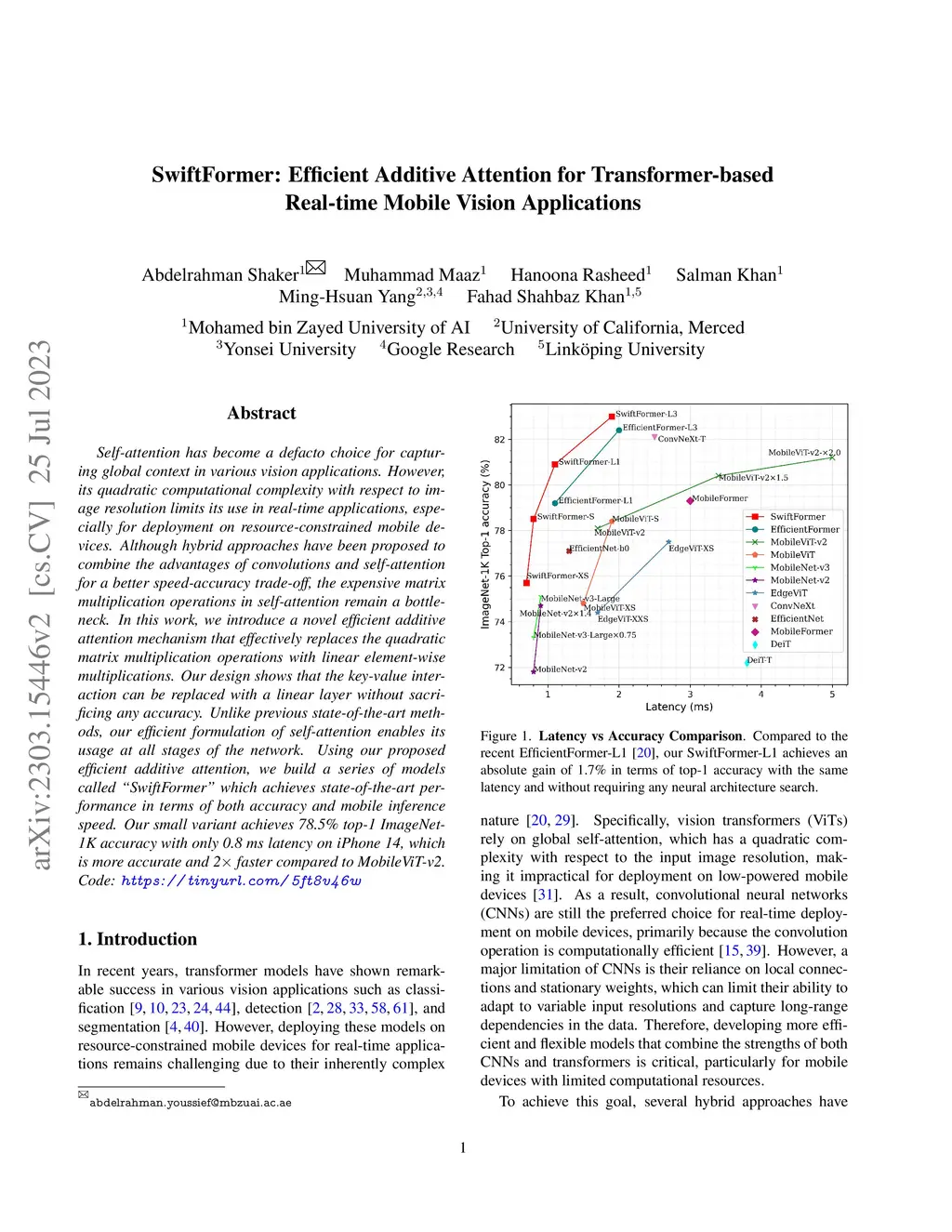 SwiftFormer: Efficient Additive Attention for Transformer-based Real-time Mobile Vision Applications