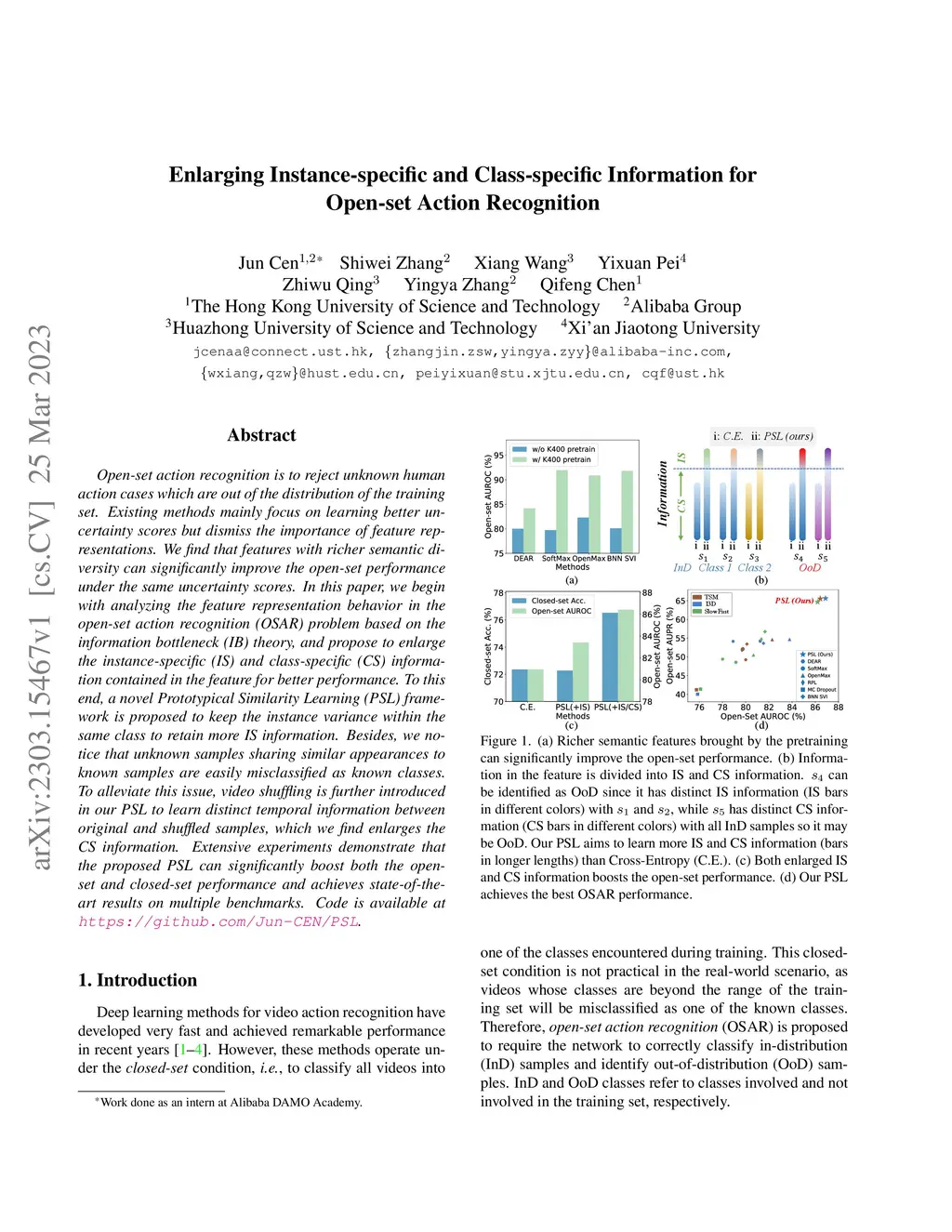 Open-set action recognition is to reject unknown human action cases which are out of the distribution of the training set. Existing methods mainly focus on learning better uncertainty scores but dismiss the importance of feature representations. We find that features with richer semantic diversity can significantly improve the open-set performance under the same uncertainty scores. In this paper, we begin with analyzing the feature representation behavior in the open-set action recognition (OSAR) problem based on the information bottleneck (IB) theory, and propose to enlarge the instance-specific (IS) and class-specific (CS) information contained in the feature for better performance. To this end, a novel Prototypical Similarity Learning (PSL) framework is proposed to keep the instance variance within the same class to retain more IS information. Besides, we notice that unknown samples sharing similar appearances to known samples are easily misclassified as known classes. To alleviate this issue, video shuffling is further introduced in our PSL to learn distinct temporal information between original and shuffled samples, which we find enlarges the CS information. Extensive experiments demonstrate that the proposed PSL can significantly boost both the open-set and closed-set performance and achieves state-of-the-art results on multiple benchmarks. Code is available at https://github.com/Jun-CEN/PSL.