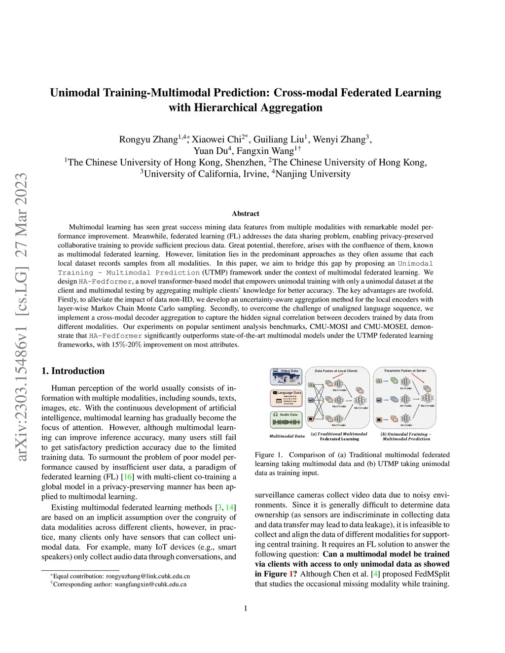 Multimodal learning has seen great success mining data features from multiple modalities with remarkable model performance improvement. Meanwhile, federated learning (FL) addresses the data sharing problem, enabling privacy-preserved collaborative training to provide sufficient precious data. Great potential, therefore, arises with the confluence of them, known as multimodal federated learning. However, limitation lies in the predominant approaches as they often assume that each local dataset records samples from all modalities. In this paper, we aim to bridge this gap by proposing an Unimodal Training - Multimodal Prediction (UTMP) framework under the context of multimodal federated learning. We design HA-Fedformer, a novel transformer-based model that empowers unimodal training with only a unimodal dataset at the client and multimodal testing by aggregating multiple clients' knowledge for better accuracy. The key advantages are twofold. Firstly, to alleviate the impact of data non-IID, we develop an uncertainty-aware aggregation method for the local encoders with layer-wise Markov Chain Monte Carlo sampling. Secondly, to overcome the challenge of unaligned language sequence, we implement a cross-modal decoder aggregation to capture the hidden signal correlation between decoders trained by data from different modalities. Our experiments on popular sentiment analysis benchmarks, CMU-MOSI and CMU-MOSEI, demonstrate that HA-Fedformer significantly outperforms state-of-the-art multimodal models under the UTMP federated learning frameworks, with 15%-20% improvement on most attributes.