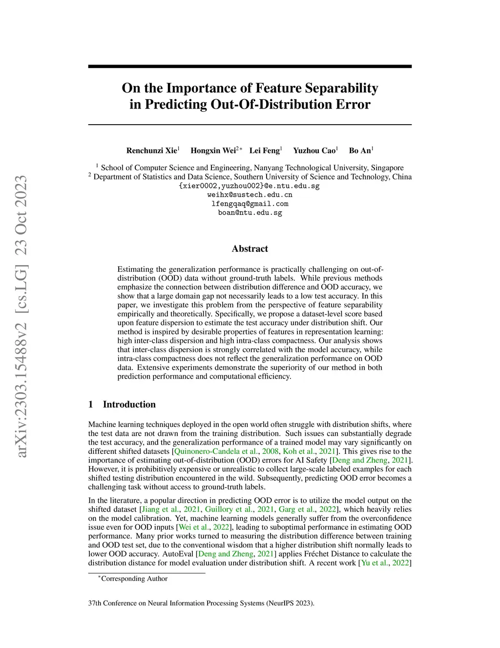 Estimating the generalization performance is practically challenging on out-of-distribution (OOD) data without ground-truth labels. While previous methods emphasize the connection between distribution difference and OOD accuracy, we show that a large domain gap not necessarily leads to a low test accuracy. In this paper, we investigate this problem from the perspective of feature separability empirically and theoretically. Specifically, we propose a dataset-level score based upon feature dispersion to estimate the test accuracy under distribution shift. Our method is inspired by desirable properties of features in representation learning: high inter-class dispersion and high intra-class compactness. Our analysis shows that inter-class dispersion is strongly correlated with the model accuracy, while intra-class compactness does not reflect the generalization performance on OOD data. Extensive experiments demonstrate the superiority of our method in both prediction performance and computational efficiency.
