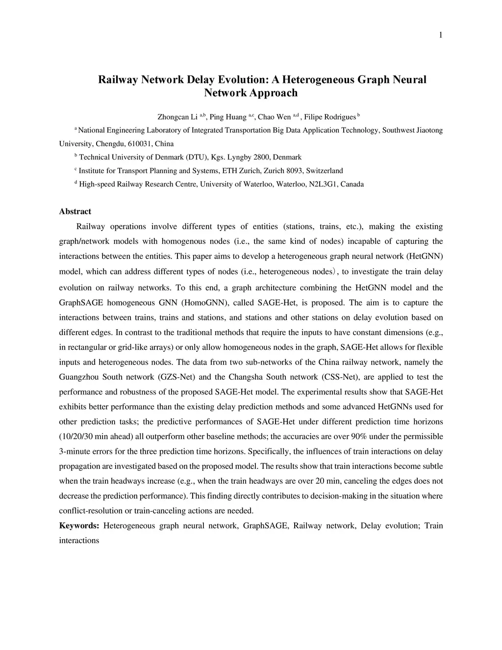 Railway operations involve different types of entities (stations, trains, etc.), making the existing graph/network models with homogenous nodes (i.e., the same kind of nodes) incapable of capturing the interactions between the entities. This paper aims to develop a heterogeneous graph neural network (HetGNN) model, which can address different types of nodes (i.e., heterogeneous nodes), to investigate the train delay evolution on railway networks. To this end, a graph architecture combining the HetGNN model and the GraphSAGE homogeneous GNN (HomoGNN), called SAGE-Het, is proposed. The aim is to capture the interactions between trains, trains and stations, and stations and other stations on delay evolution based on different edges. In contrast to the traditional methods that require the inputs to have constant dimensions (e.g., in rectangular or grid-like arrays) or only allow homogeneous nodes in the graph, SAGE-Het allows for flexible inputs and heterogeneous nodes. The data from two sub-networks of the China railway network are applied to test the performance and robustness of the proposed SAGE-Het model. The experimental results show that SAGE-Het exhibits better performance than the existing delay prediction methods and some advanced HetGNNs used for other prediction tasks; the predictive performances of SAGE-Het under different prediction time horizons (10/20/30 min ahead) all outperform other baseline methods; Specifically, the influences of train interactions on delay propagation are investigated based on the proposed model. The results show that train interactions become subtle when the train headways increase . This finding directly contributes to decision-making in the situation where conflict-resolution or train-canceling actions are needed.
