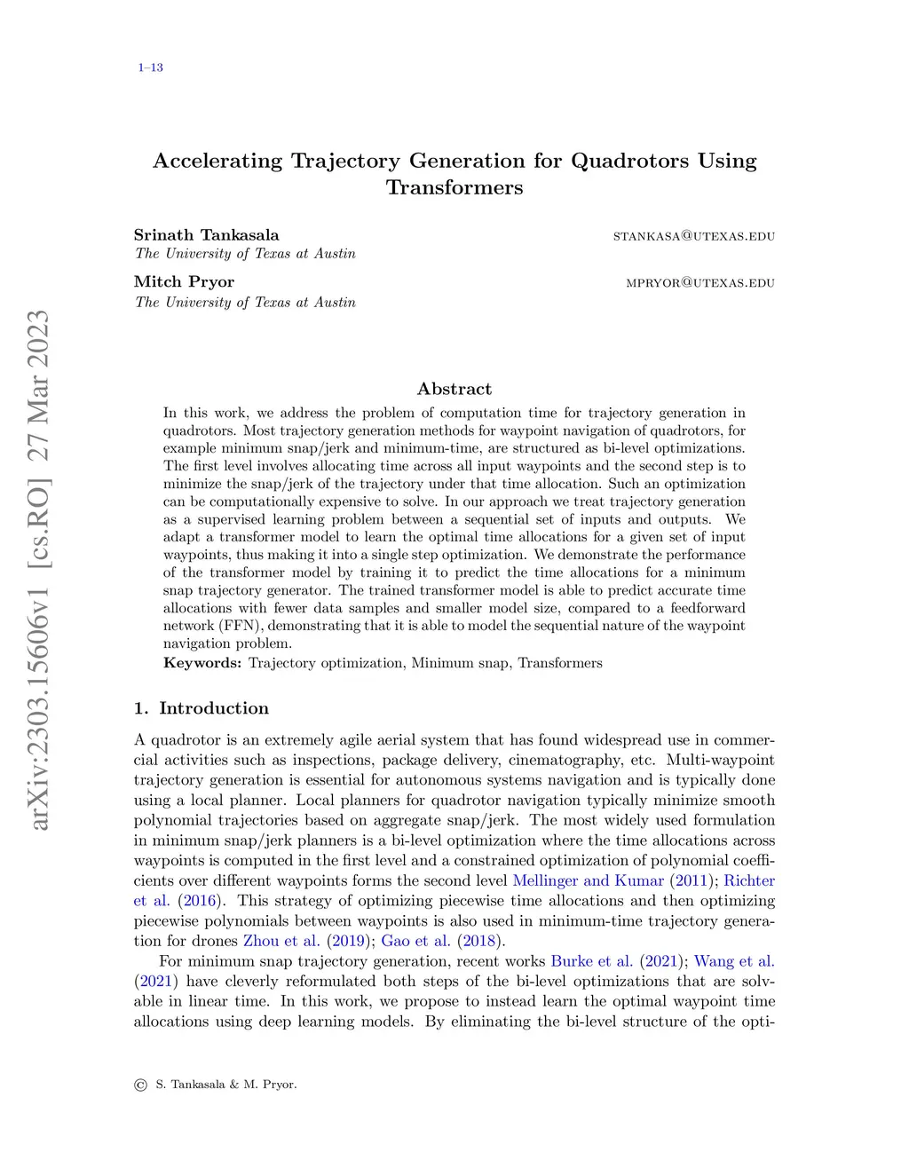 In this work, we address the problem of computation time for trajectory generation in quadrotors. Most trajectory generation methods for waypoint navigation of quadrotors, for example minimum snap/jerk and minimum-time, are structured as bi-level optimizations. The first level involves allocating time across all input waypoints and the second step is to minimize the snap/jerk of the trajectory under that time allocation. Such an optimization can be computationally expensive to solve. In our approach we treat trajectory generation as a supervised learning problem between a sequential set of inputs and outputs. We adapt a transformer model to learn the optimal time allocations for a given set of input waypoints, thus making it into a single step optimization. We demonstrate the performance of the transformer model by training it to predict the time allocations for a minimum snap trajectory generator. The trained transformer model is able to predict accurate time allocations with fewer data samples and smaller model size, compared to a feedforward network (FFN), demonstrating that it is able to model the sequential nature of the waypoint navigation problem.