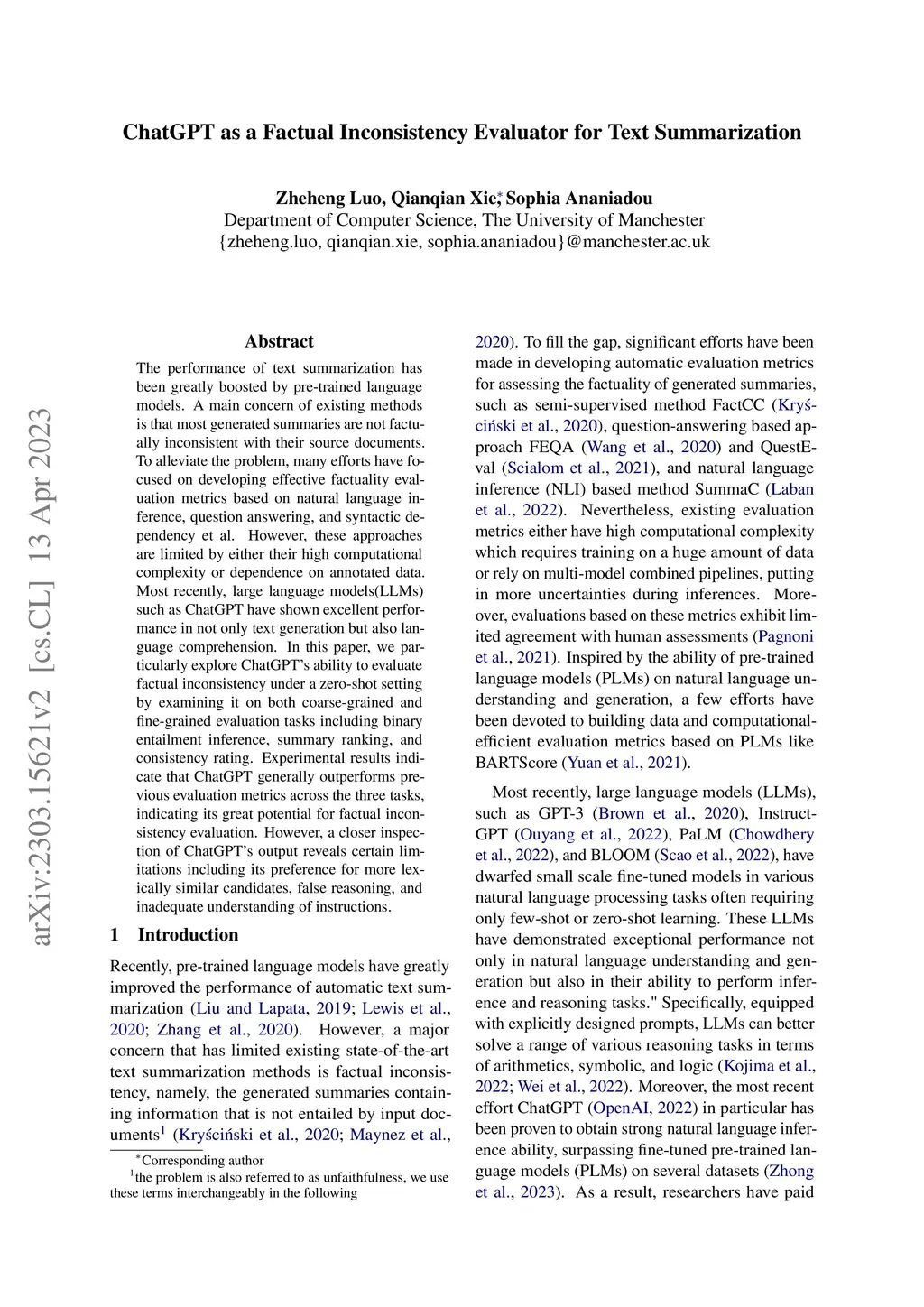 The performance of text summarization has been greatly boosted by pre-trained language models. A main concern of existing methods is that most generated summaries are not factually inconsistent with their source documents. To alleviate the problem, many efforts have focused on developing effective factuality evaluation metrics based on natural language inference, question answering, and syntactic dependency et al. However, these approaches are limited by either their high computational complexity or the uncertainty introduced by multi-component pipelines, resulting in only partial agreement with human judgement. Most recently, large language models(LLMs) have shown excellent performance in not only text generation but also language comprehension. In this paper, we particularly explore ChatGPT's ability to evaluate factual inconsistency under a zero-shot setting by examining it on both coarse-grained and fine-grained evaluation tasks including binary entailment inference, summary ranking, and consistency rating. Experimental results indicate that ChatGPT generally outperforms previous evaluation metrics across the three tasks, indicating its great potential for factual inconsistency evaluation. However, a closer inspection of ChatGPT's output reveals certain limitations including its preference for more lexically similar candidates, false reasoning, and inadequate understanding of instructions.