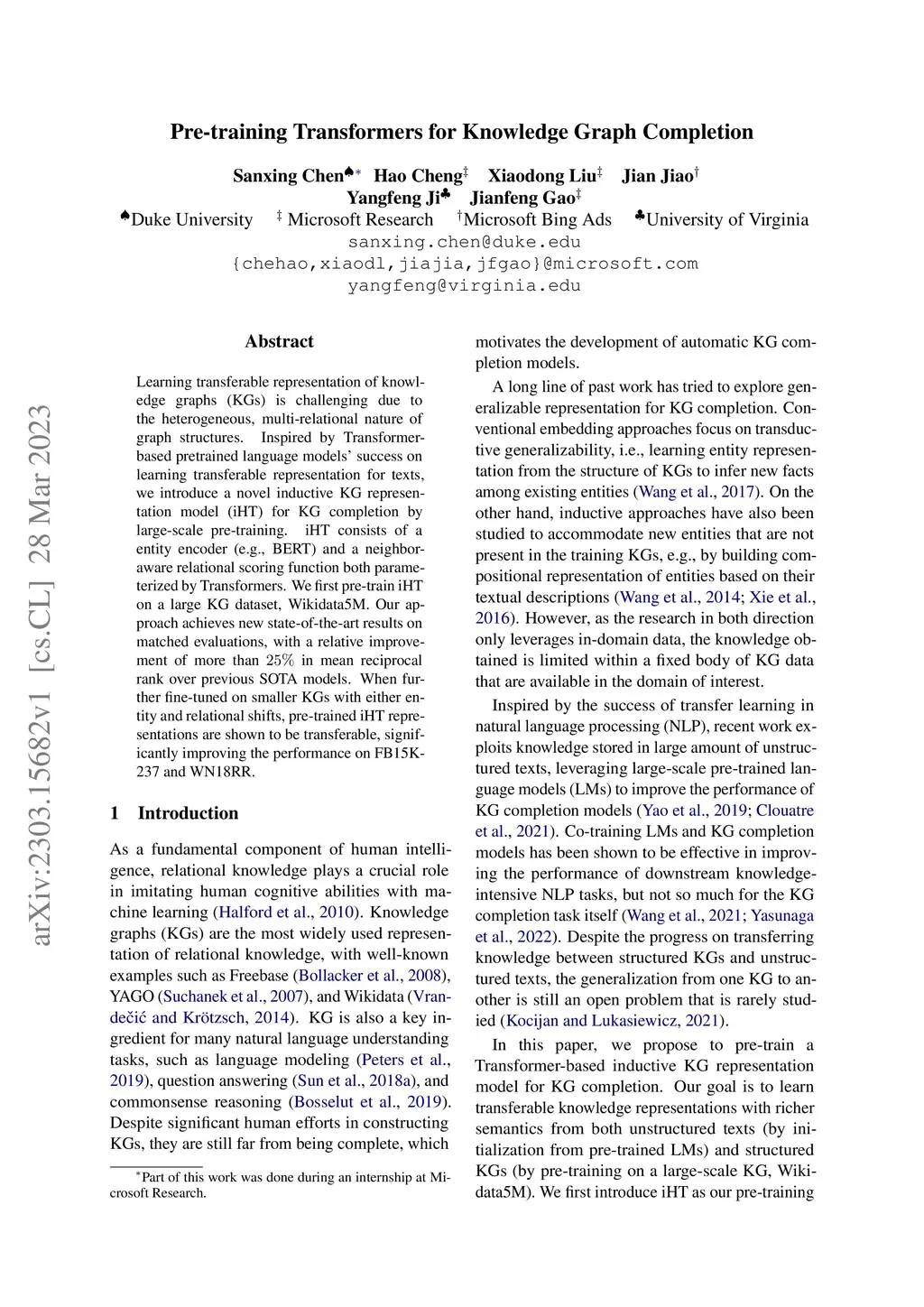 Pre-training Transformers for Knowledge Graph Completion