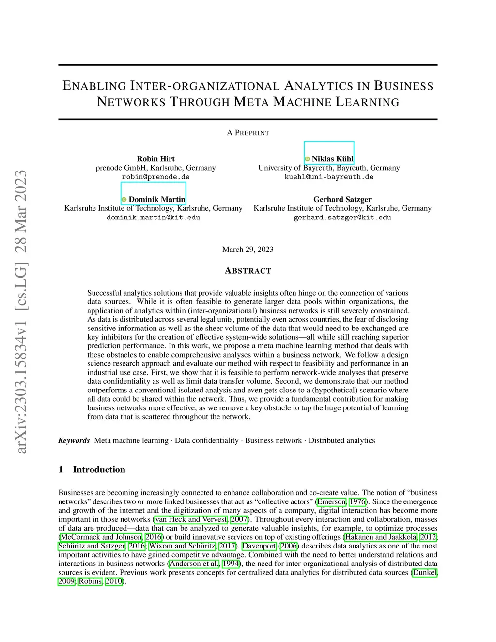 Successful analytics solutions that provide valuable insights often hinge on the connection of various data sources. While it is often feasible to generate larger data pools within organizations, the application of analytics within (inter-organizational) business networks is still severely constrained. As data is distributed across several legal units, potentially even across countries, the fear of disclosing sensitive information as well as the sheer volume of the data that would need to be exchanged are key inhibitors for the creation of effective system-wide solutions -- all while still reaching superior prediction performance. In this work, we propose a meta machine learning method that deals with these obstacles to enable comprehensive analyses within a business network. We follow a design science research approach and evaluate our method with respect to feasibility and performance in an industrial use case. First, we show that it is feasible to perform network-wide analyses that preserve data confidentiality as well as limit data transfer volume. Second, we demonstrate that our method outperforms a conventional isolated analysis and even gets close to a (hypothetical) scenario where all data could be shared within the network. Thus, we provide a fundamental contribution for making business networks more effective, as we remove a key obstacle to tap the huge potential of learning from data that is scattered throughout the network.