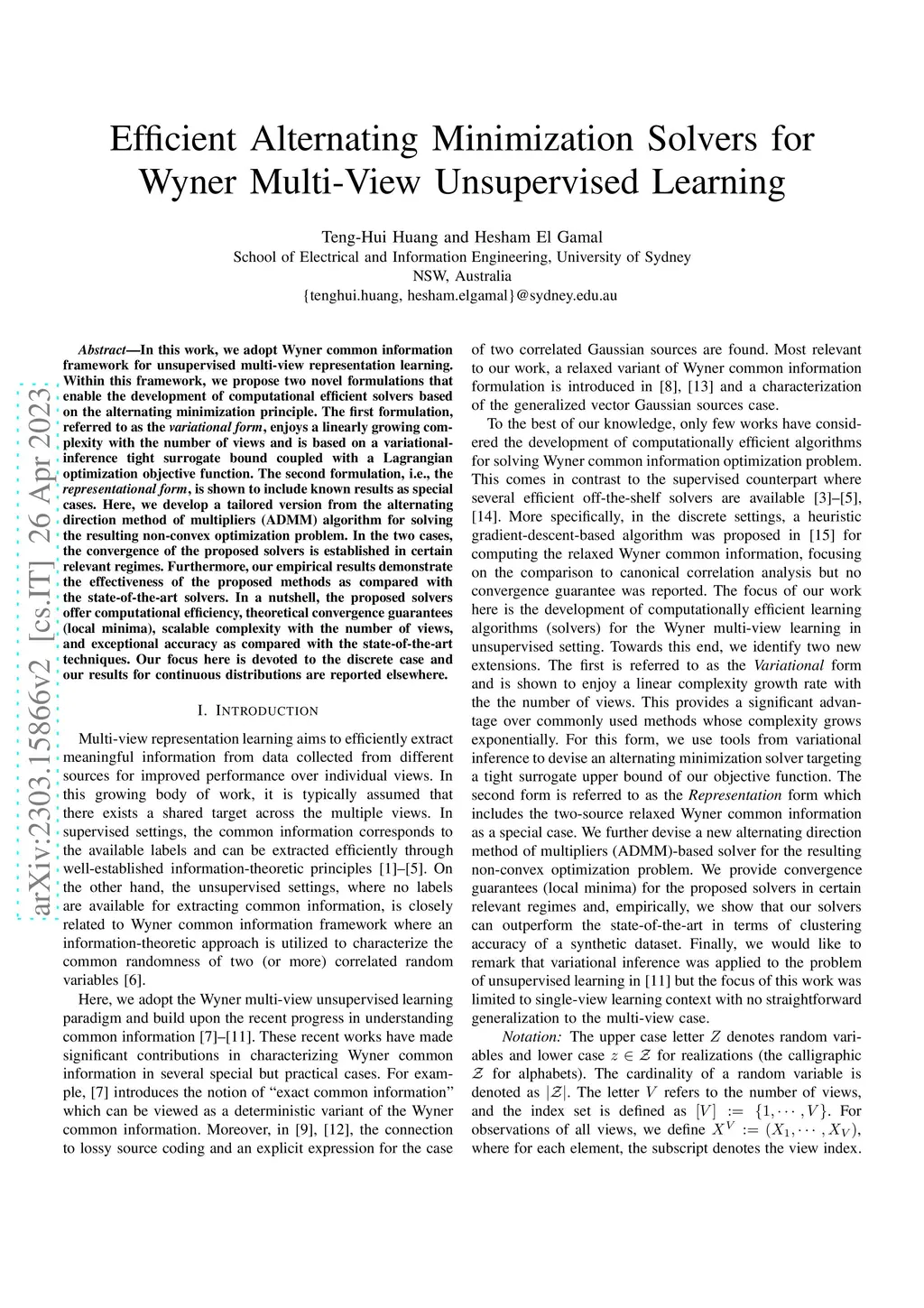 In this work, we adopt Wyner common information framework for unsupervised multi-view representation learning. Within this framework, we propose two novel formulations that enable the development of computational efficient solvers based on the alternating minimization principle. The first formulation, referred to as the {\em variational form}, enjoys a linearly growing complexity with the number of views and is based on a variational-inference tight surrogate bound coupled with a Lagrangian optimization objective function. The second formulation, i.e., the {\em representational form}, is shown to include known results as special cases. Here, we develop a tailored version from the alternating direction method of multipliers (ADMM) algorithm for solving the resulting non-convex optimization problem. In the two cases, the convergence of the proposed solvers is established in certain relevant regimes. Furthermore, our empirical results demonstrate the effectiveness of the proposed methods as compared with the state-of-the-art solvers. In a nutshell, the proposed solvers offer computational efficiency, theoretical convergence guarantees (local minima), scalable complexity with the number of views, and exceptional accuracy as compared with the state-of-the-art techniques. Our focus here is devoted to the discrete case and our results for continuous distributions are reported elsewhere.