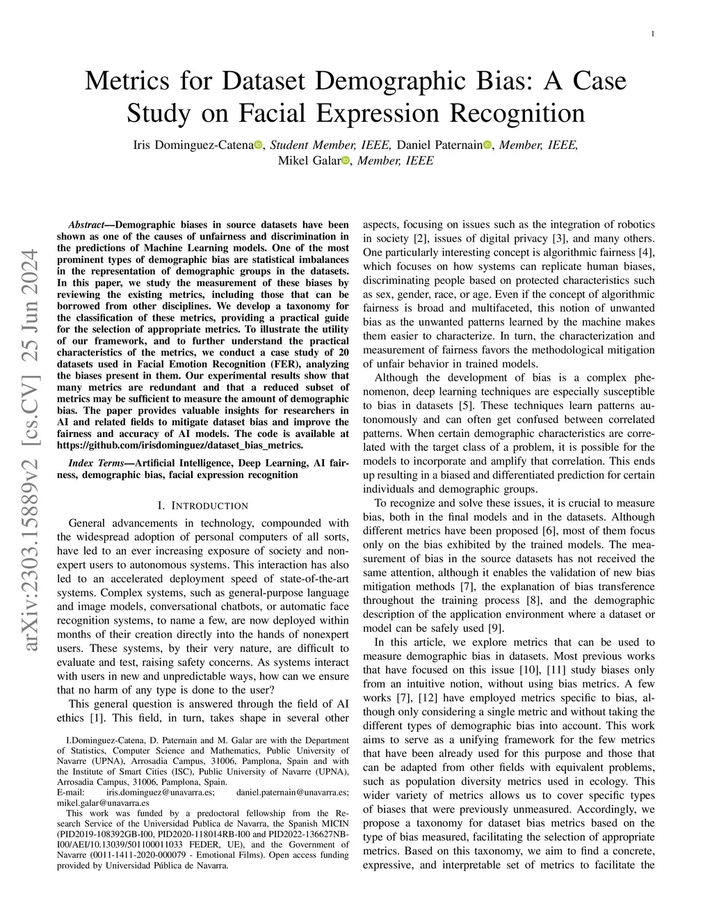 Metrics for Dataset Demographic Bias: A Case Study on Facial Expression