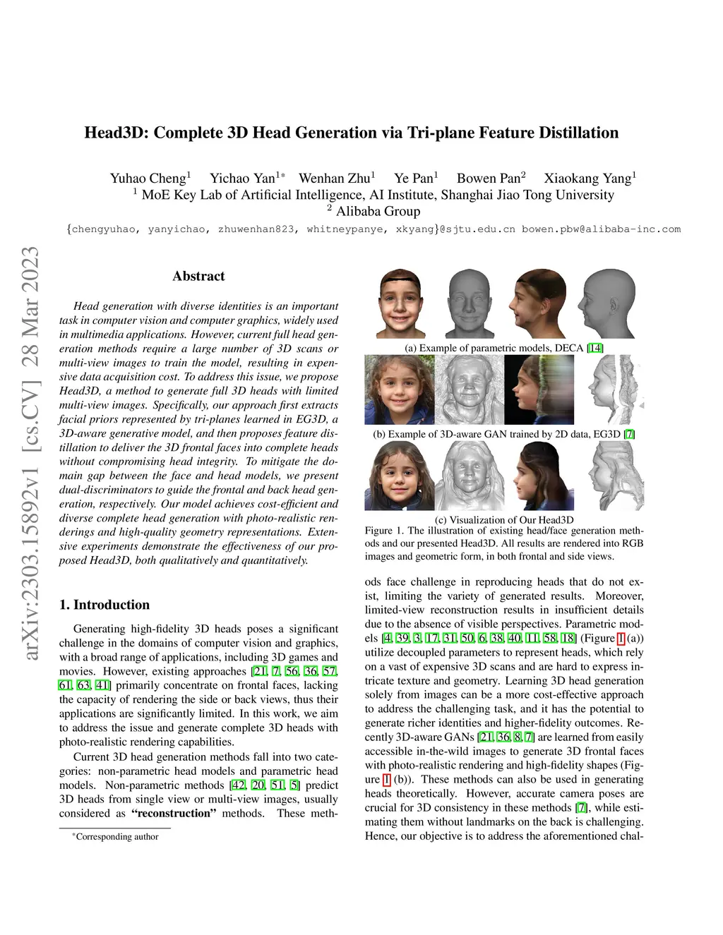 Head3D: Complete 3D Head Generation via Tri-plane Feature Distillation