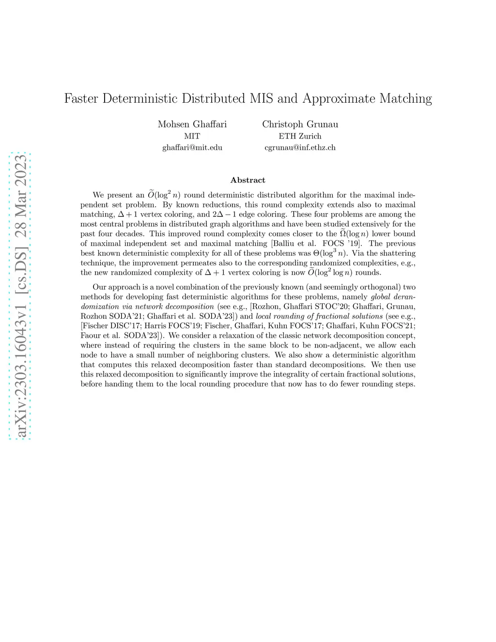 $ \renewcommand{\tilde}{\widetilde} $We present an round deterministic distributed algorithm for the maximal independent set problem. By known reductions, this round complexity extends also to maximal matching, vertex coloring, and edge coloring. These four problems are among the most central problems in distributed graph algorithms and have been studied extensively for the past four decades. This improved round complexity comes closer to the lower bound of maximal independent set and maximal matching [Balliu et al. FOCS '19]. The previous best known deterministic complexity for all of these problems was . Via the shattering technique, the improvement permeates also to the corresponding randomized complexities, e.g., the new randomized complexity of vertex coloring is now rounds. Our approach is a novel combination of the previously known two methods for developing deterministic algorithms for these problems, namely global derandomization via network decomposition (see e.g., [Rozhon, Ghaffari STOC'20; Ghaffari, Grunau, Rozhon SODA'21; Ghaffari et al. SODA'23]) and local rounding of fractional solutions (see e.g., [Fischer DISC'17; Harris FOCS'19; Fischer, Ghaffari, Kuhn FOCS'17; Ghaffari, Kuhn FOCS'21; Faour et al. SODA'23]). We consider a relaxation of the classic network decomposition concept, where instead of requiring the clusters in the same block to be non-adjacent, we allow each node to have a small number of neighboring clusters. We also show a deterministic algorithm that computes this relaxed decomposition faster than standard decompositions. We then use this relaxed decomposition to significantly improve the integrality of certain fractional solutions, before handing them to the local rounding procedure that now has to do fewer rounding steps.