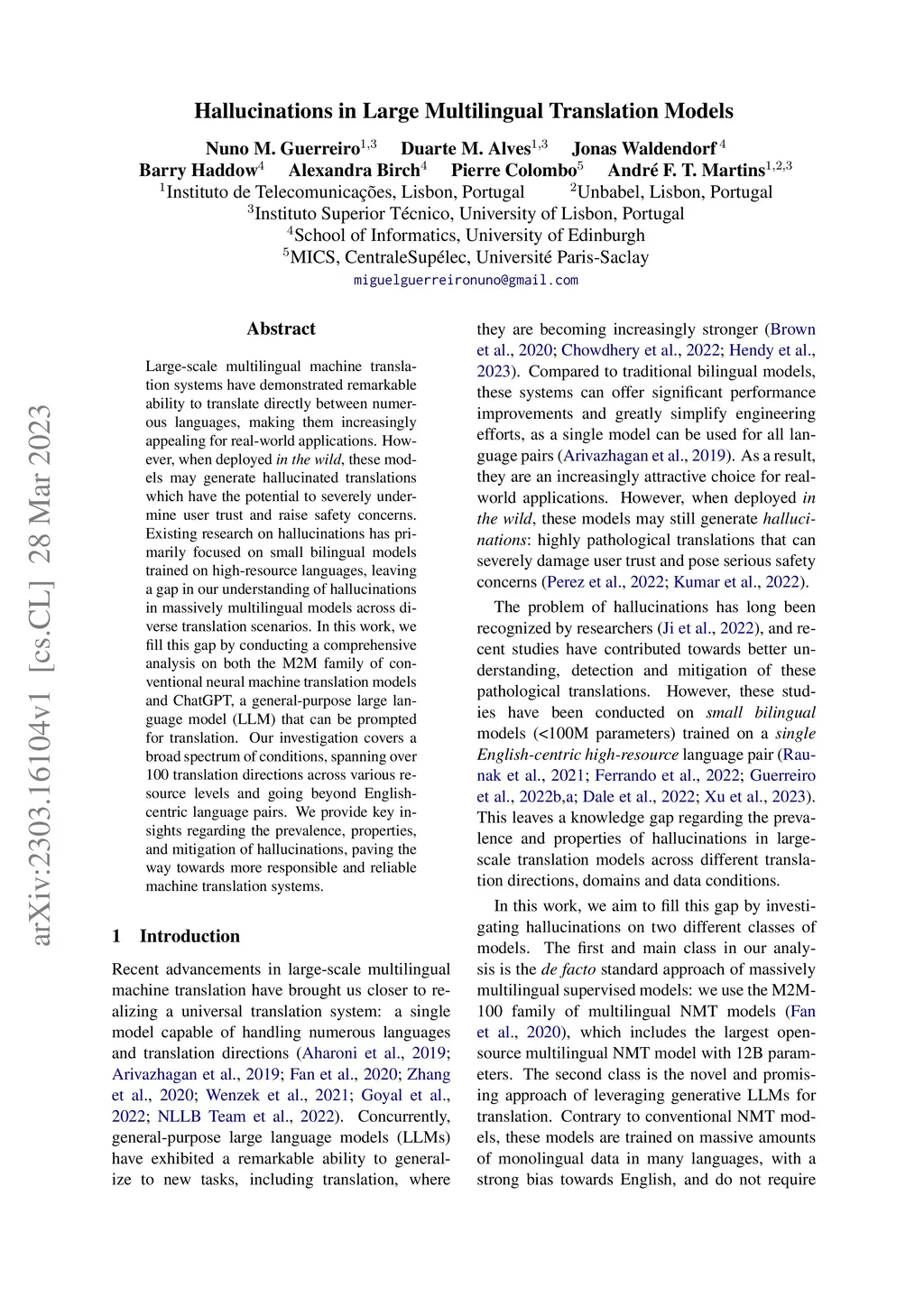 Large-scale multilingual machine translation systems have demonstrated remarkable ability to translate directly between numerous languages, making them increasingly appealing for real-world applications. However, when deployed in the wild, these models may generate hallucinated translations which have the potential to severely undermine user trust and raise safety concerns. Existing research on hallucinations has primarily focused on small bilingual models trained on high-resource languages, leaving a gap in our understanding of hallucinations in massively multilingual models across diverse translation scenarios. In this work, we fill this gap by conducting a comprehensive analysis on both the M2M family of conventional neural machine translation models and ChatGPT, a general-purpose large language model~(LLM) that can be prompted for translation. Our investigation covers a broad spectrum of conditions, spanning over 100 translation directions across various resource levels and going beyond English-centric language pairs. We provide key insights regarding the prevalence, properties, and mitigation of hallucinations, paving the way towards more responsible and reliable machine translation systems.