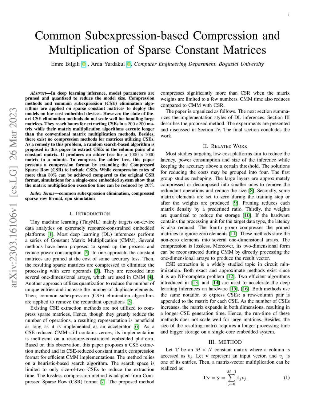 In deep learning inference, model parameters are pruned and quantized to reduce the model size. Compression methods and common subexpression (CSE) elimination algorithms are applied on sparse constant matrices to deploy the models on low-cost embedded devices. However, the state-of-the-art CSE elimination methods do not scale well for handling large matrices. They reach hours for extracting CSEs in a matrix while their matrix multiplication algorithms execute longer than the conventional matrix multiplication methods. Besides, there exist no compression methods for matrices utilizing CSEs. As a remedy to this problem, a random search-based algorithm is proposed in this paper to extract CSEs in the column pairs of a constant matrix. It produces an adder tree for a matrix in a minute. To compress the adder tree, this paper presents a compression format by extending the Compressed Sparse Row (CSR) to include CSEs. While compression rates of more than can be achieved compared to the original CSR format, simulations for a single-core embedded system show that the matrix multiplication execution time can be reduced by .