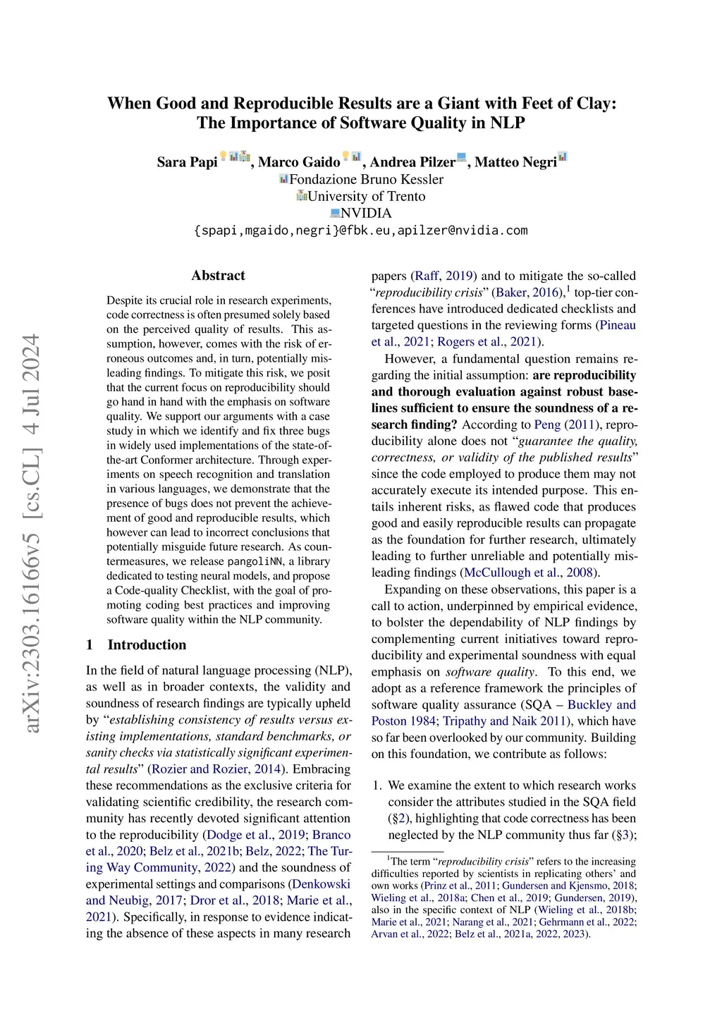 Despite its crucial role in research experiments, code correctness is often presumed only on the basis of the perceived quality of results. This assumption comes with the risk of erroneous outcomes and potentially misleading findings. To address this issue, we posit that the current focus on reproducibility should go hand in hand with the emphasis on software quality. We present a case study in which we identify and fix three bugs in widely used implementations of the state-of-the-art Conformer architecture. Through experiments on speech recognition and translation in various languages, we demonstrate that the presence of bugs does not prevent the achievement of good and reproducible results, which however can lead to incorrect conclusions that potentially misguide future research. As a countermeasure, we propose a Code-quality Checklist and release pangoliNN, a library dedicated to testing neural models, with the goal of promoting coding best practices and improving research software quality within the NLP community.