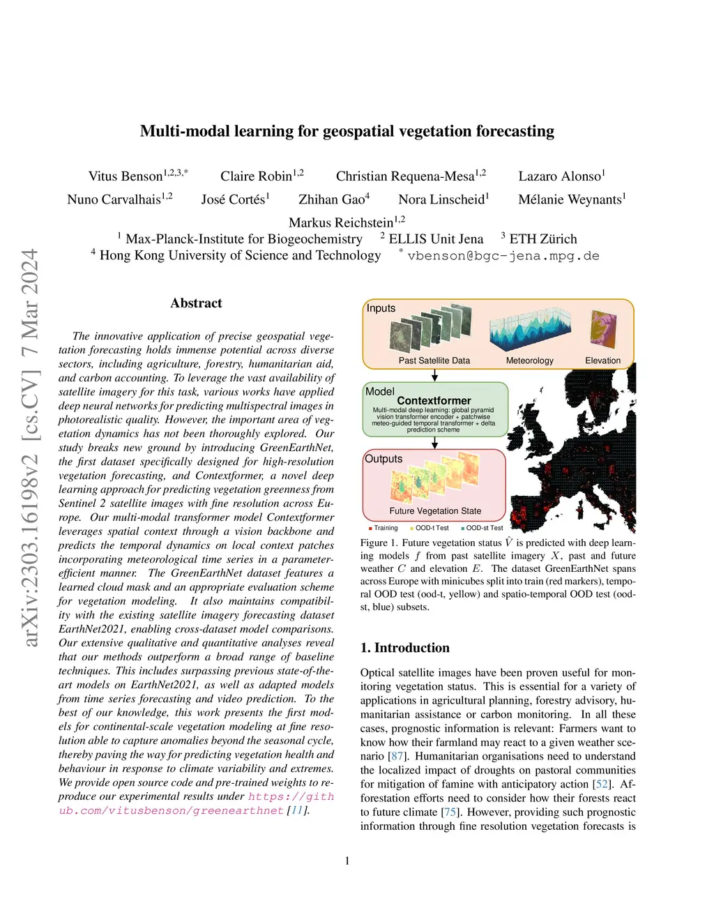The innovative application of precise geospatial vegetation forecasting holds immense potential across diverse sectors, including agriculture, forestry, humanitarian aid, and carbon accounting. To leverage the vast availability of satellite imagery for this task, various works have applied deep neural networks for predicting multispectral images in photorealistic quality. However, the important area of vegetation dynamics has not been thoroughly explored. Our study breaks new ground by introducing GreenEarthNet, the first dataset specifically designed for high-resolution vegetation forecasting, and Contextformer, a novel deep learning approach for predicting vegetation greenness from Sentinel 2 satellite images with fine resolution across Europe. Our multi-modal transformer model Contextformer leverages spatial context through a vision backbone and predicts the temporal dynamics on local context patches incorporating meteorological time series in a parameter-efficient manner. The GreenEarthNet dataset features a learned cloud mask and an appropriate evaluation scheme for vegetation modeling. It also maintains compatibility with the existing satellite imagery forecasting dataset EarthNet2021, enabling cross-dataset model comparisons. Our extensive qualitative and quantitative analyses reveal that our methods outperform a broad range of baseline techniques. This includes surpassing previous state-of-the-art models on EarthNet2021, as well as adapted models from time series forecasting and video prediction. To the best of our knowledge, this work presents the first models for continental-scale vegetation modeling at fine resolution able to capture anomalies beyond the seasonal cycle, thereby paving the way for predicting vegetation health and behaviour in response to climate variability and extremes.