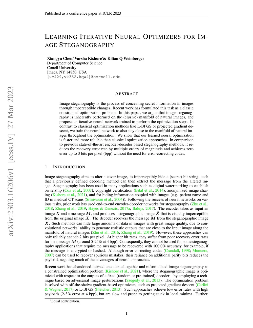 Image steganography is the process of concealing secret information in images through imperceptible changes. Recent work has formulated this task as a classic constrained optimization problem. In this paper, we argue that image steganography is inherently performed on the (elusive) manifold of natural images, and propose an iterative neural network trained to perform the optimization steps. In contrast to classical optimization methods like L-BFGS or projected gradient descent, we train the neural network to also stay close to the manifold of natural images throughout the optimization. We show that our learned neural optimization is faster and more reliable than classical optimization approaches. In comparison to previous state-of-the-art encoder-decoder-based steganography methods, it reduces the recovery error rate by multiple orders of magnitude and achieves zero error up to 3 bits per pixel (bpp) without the need for error-correcting codes.