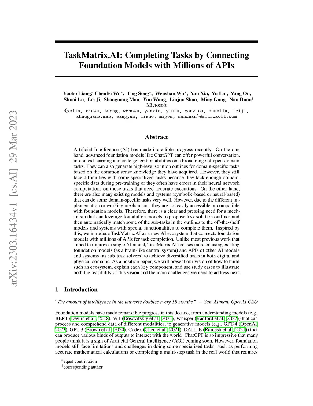 Artificial Intelligence (AI) has made incredible progress recently. On the one hand, advanced foundation models like ChatGPT can offer powerful conversation, in-context learning and code generation abilities on a broad range of open-domain tasks. They can also generate high-level solution outlines for domain-specific tasks based on the common sense knowledge they have acquired. However, they still face difficulties with some specialized tasks because they lack enough domain-specific data during pre-training or they often have errors in their neural network computations on those tasks that need accurate executions. On the other hand, there are also many existing models and systems (symbolic-based or neural-based) that can do some domain-specific tasks very well. However, due to the different implementation or working mechanisms, they are not easily accessible or compatible with foundation models. Therefore, there is a clear and pressing need for a mechanism that can leverage foundation models to propose task solution outlines and then automatically match some of the sub-tasks in the outlines to the off-the-shelf models and systems with special functionalities to complete them. Inspired by this, we introduce TaskMatrix.AI as a new AI ecosystem that connects foundation models with millions of APIs for task completion. Unlike most previous work that aimed to improve a single AI model, TaskMatrix.AI focuses more on using existing foundation models (as a brain-like central system) and APIs of other AI models and systems (as sub-task solvers) to achieve diversified tasks in both digital and physical domains. As a position paper, we will present our vision of how to build such an ecosystem, explain each key component, and use study cases to illustrate both the feasibility of this vision and the main challenges we need to address next.