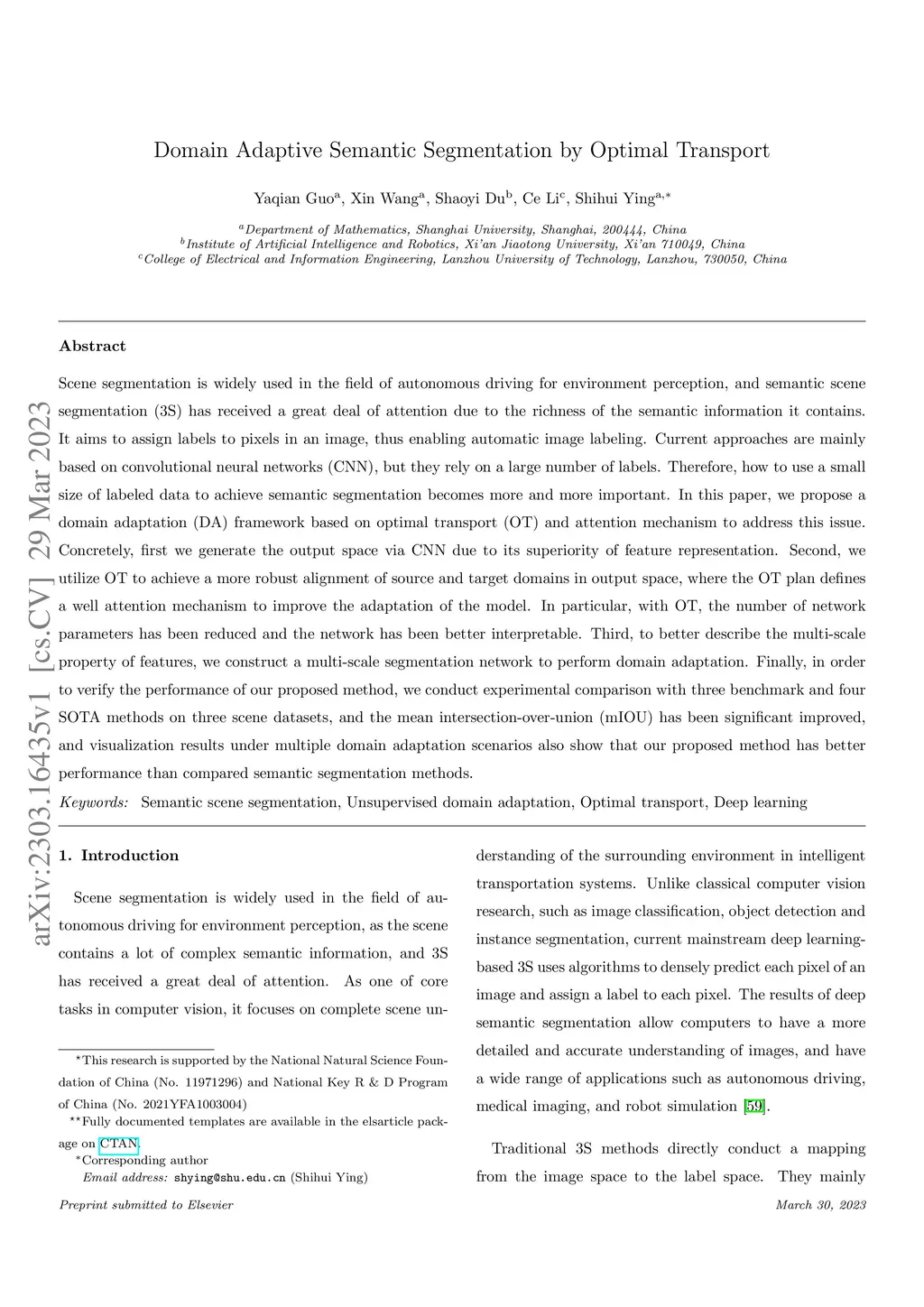 Scene segmentation is widely used in the field of autonomous driving for environment perception, and semantic scene segmentation (3S) has received a great deal of attention due to the richness of the semantic information it contains. It aims to assign labels to pixels in an image, thus enabling automatic image labeling. Current approaches are mainly based on convolutional neural networks (CNN), but they rely on a large number of labels. Therefore, how to use a small size of labeled data to achieve semantic segmentation becomes more and more important. In this paper, we propose a domain adaptation (DA) framework based on optimal transport (OT) and attention mechanism to address this issue. Concretely, first we generate the output space via CNN due to its superiority of feature representation. Second, we utilize OT to achieve a more robust alignment of source and target domains in output space, where the OT plan defines a well attention mechanism to improve the adaptation of the model. In particular, with OT, the number of network parameters has been reduced and the network has been better interpretable. Third, to better describe the multi-scale property of features, we construct a multi-scale segmentation network to perform domain adaptation. Finally, in order to verify the performance of our proposed method, we conduct experimental comparison with three benchmark and four SOTA methods on three scene datasets, and the mean intersection-over-union (mIOU) has been significant improved, and visualization results under multiple domain adaptation scenarios also show that our proposed method has better performance than compared semantic segmentation methods.