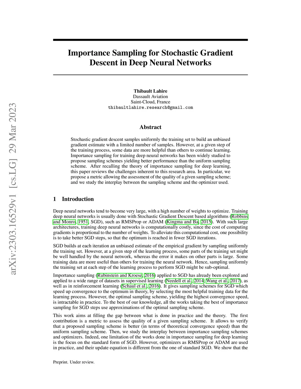 Stochastic gradient descent samples uniformly the training set to build an unbiased gradient estimate with a limited number of samples. However, at a given step of the training process, some data are more helpful than others to continue learning. Importance sampling for training deep neural networks has been widely studied to propose sampling schemes yielding better performance than the uniform sampling scheme. After recalling the theory of importance sampling for deep learning, this paper reviews the challenges inherent to this research area. In particular, we propose a metric allowing the assessment of the quality of a given sampling scheme; and we study the interplay between the sampling scheme and the optimizer used.