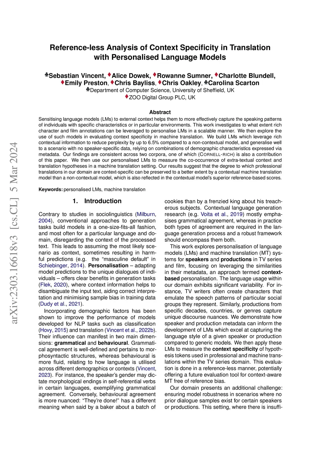 Sensitising language models (LMs) to external context helps them to more effectively capture the speaking patterns of individuals with specific characteristics or in particular environments. This work investigates to what extent rich character and film annotations can be leveraged to personalise LMs in a scalable manner. We then explore the use of such models in evaluating context specificity in machine translation. We build LMs which leverage rich contextual information to reduce perplexity by up to 6.5% compared to a non-contextual model, and generalise well to a scenario with no speaker-specific data, relying on combinations of demographic characteristics expressed via metadata. Our findings are consistent across two corpora, one of which (Cornell-rich) is also a contribution of this paper. We then use our personalised LMs to measure the co-occurrence of extra-textual context and translation hypotheses in a machine translation setting. Our results suggest that the degree to which professional translations in our domain are context-specific can be preserved to a better extent by a contextual machine translation model than a non-contextual model, which is also reflected in the contextual model's superior reference-based scores.
