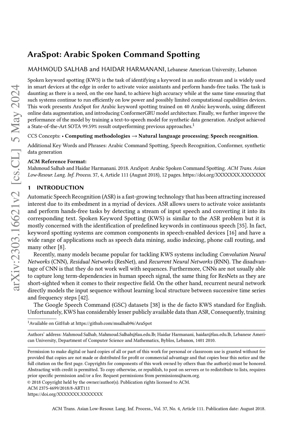 Spoken keyword spotting (KWS) is the task of identifying a keyword in an audio stream and is widely used in smart devices at the edge in order to activate voice assistants and perform hands-free tasks. The task is daunting as there is a need, on the one hand, to achieve high accuracy while at the same time ensuring that such systems continue to run efficiently on low power and possibly limited computational capabilities devices. This work presents AraSpot for Arabic keyword spotting trained on 40 Arabic keywords, using different online data augmentation, and introducing ConformerGRU model architecture. Finally, we further improve the performance of the model by training a text-to-speech model for synthetic data generation. AraSpot achieved a State-of-the-Art SOTA 99.59% result outperforming previous approaches.