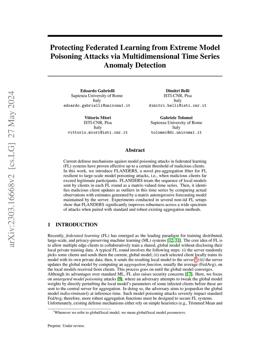 Current defense mechanisms against model poisoning attacks in federated learning (FL) systems have proven effective up to a certain threshold of malicious clients. In this work, we introduce FLANDERS, a novel pre-aggregation filter for FL resilient to large-scale model poisoning attacks, i.e., when malicious clients far exceed legitimate participants. FLANDERS treats the sequence of local models sent by clients in each FL round as a matrix-valued time series. Then, it identifies malicious client updates as outliers in this time series by comparing actual observations with estimates generated by a matrix autoregressive forecasting model maintained by the server. Experiments conducted in several non-iid FL setups show that FLANDERS significantly improves robustness across a wide spectrum of attacks when paired with standard and robust existing aggregation methods.