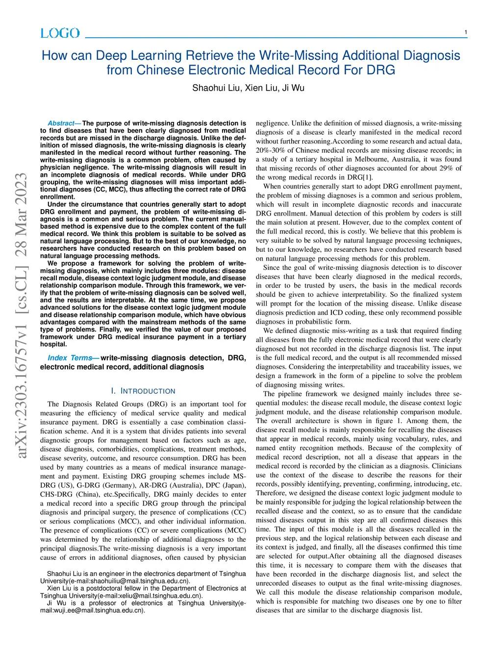 The purpose of write-missing diagnosis detection is to find diseases that have been clearly diagnosed from medical records but are missed in the discharge diagnosis. Unlike the definition of missed diagnosis, the write-missing diagnosis is clearly manifested in the medical record without further reasoning. The write-missing diagnosis is a common problem, often caused by physician negligence. The write-missing diagnosis will result in an incomplete diagnosis of medical records. While under DRG grouping, the write-missing diagnoses will miss important additional diagnoses (CC, MCC), thus affecting the correct rate of DRG enrollment. Under the circumstance that countries generally start to adopt DRG enrollment and payment, the problem of write-missing diagnosis is a common and serious problem. The current manual-based method is expensive due to the complex content of the full medical record. We think this problem is suitable to be solved as natural language processing. But to the best of our knowledge, no researchers have conducted research on this problem based on natural language processing methods. We propose a framework for solving the problem of write-missing diagnosis, which mainly includes three modules: disease recall module, disease context logic judgment module, and disease relationship comparison module. Through this framework, we verify that the problem of write-missing diagnosis can be solved well, and the results are interpretable. At the same time, we propose advanced solutions for the disease context logic judgment module and disease relationship comparison module, which have obvious advantages compared with the mainstream methods of the same type of problems. Finally, we verified the value of our proposed framework under DRG medical insurance payment in a tertiary hospital.