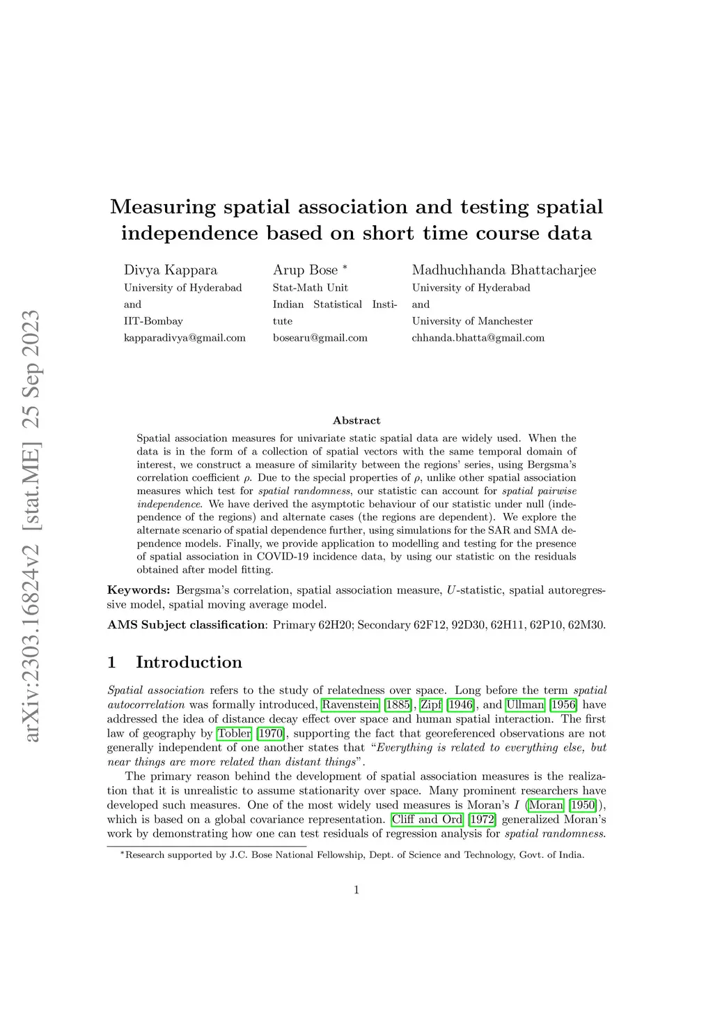 Spatial association measures for univariate static spatial data are widely used. When the data is in the form of a collection of spatial vectors with the same temporal domain of interest, we construct a measure of similarity between the regions' series, using Bergsma's correlation coefficient . Due to the special properties of , unlike other spatial association measures which test for spatial randomness, our statistic can account for spatial pairwise independence. We have derived the asymptotic behavior of our statistic under null (independence of the regions) and alternate cases (the regions are dependent). We explore the alternate scenario of spatial dependence further, using simulations for the SAR and SMA dependence models. Finally, we provide application to modelling and testing for the presence of spatial association in COVID-19 incidence data, by using our statistic on the residuals obtained after model fitting.