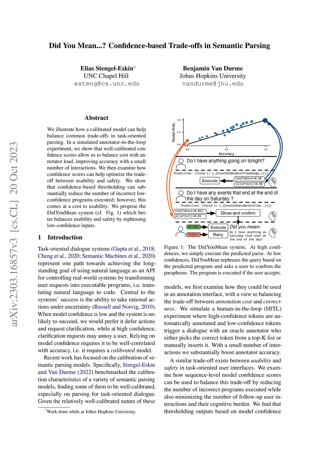 We illustrate how a calibrated model can help balance common trade-offs in task-oriented parsing. In a simulated annotator-in-the-loop experiment, we show that well-calibrated confidence scores allow us to balance cost with annotator load, improving accuracy with a small number of interactions. We then examine how confidence scores can help optimize the trade-off between usability and safety. We show that confidence-based thresholding can substantially reduce the number of incorrect low-confidence programs executed; however, this comes at a cost to usability. We propose the DidYouMean system which better balances usability and safety.