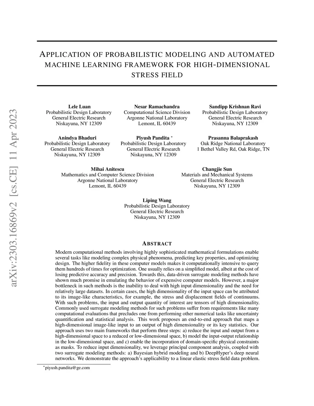 Modern computational methods, involving highly sophisticated mathematical formulations, enable several tasks like modeling complex physical phenomenon, predicting key properties and design optimization. The higher fidelity in these computer models makes it computationally intensive to query them hundreds of times for optimization and one usually relies on a simplified model albeit at the cost of losing predictive accuracy and precision. Towards this, data-driven surrogate modeling methods have shown a lot of promise in emulating the behavior of the expensive computer models. However, a major bottleneck in such methods is the inability to deal with high input dimensionality and the need for relatively large datasets. With such problems, the input and output quantity of interest are tensors of high dimensionality. Commonly used surrogate modeling methods for such problems, suffer from requirements like high number of computational evaluations that precludes one from performing other numerical tasks like uncertainty quantification and statistical analysis. In this work, we propose an end-to-end approach that maps a high-dimensional image like input to an output of high dimensionality or its key statistics. Our approach uses two main framework that perform three steps: a) reduce the input and output from a high-dimensional space to a reduced or low-dimensional space, b) model the input-output relationship in the low-dimensional space, and c) enable the incorporation of domain-specific physical constraints as masks. In order to accomplish the task of reducing input dimensionality we leverage principal component analysis, that is coupled with two surrogate modeling methods namely: a) Bayesian hybrid modeling, and b) DeepHyper's deep neural networks. We demonstrate the applicability of the approach on a problem of a linear elastic stress field data.