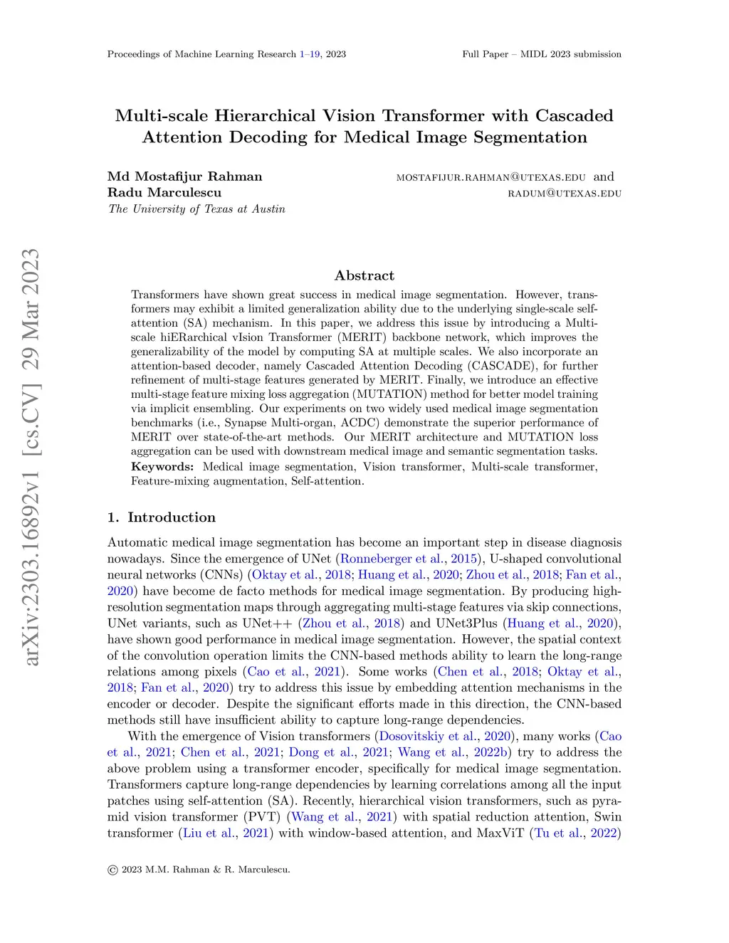Transformers have shown great success in medical image segmentation. However, transformers may exhibit a limited generalization ability due to the underlying single-scale self-attention (SA) mechanism. In this paper, we address this issue by introducing a Multi-scale hiERarchical vIsion Transformer (MERIT) backbone network, which improves the generalizability of the model by computing SA at multiple scales. We also incorporate an attention-based decoder, namely Cascaded Attention Decoding (CASCADE), for further refinement of multi-stage features generated by MERIT. Finally, we introduce an effective multi-stage feature mixing loss aggregation (MUTATION) method for better model training via implicit ensembling. Our experiments on two widely used medical image segmentation benchmarks (i.e., Synapse Multi-organ, ACDC) demonstrate the superior performance of MERIT over state-of-the-art methods. Our MERIT architecture and MUTATION loss aggregation can be used with downstream medical image and semantic segmentation tasks.