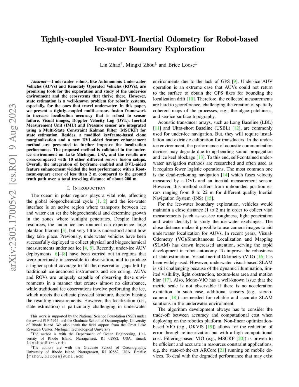 Robotic underwater systems, e.g., Autonomous Underwater Vehicles (AUVs) and Remotely Operated Vehicles (ROVs), are promising tools for collecting biogeochemical data at the ice-water interface for scientific advancements. However, state estimation, i.e., localization, is a well-known problem for robotic systems, especially, for the ones that travel underwater. In this paper, we present a tightly-coupled multi-sensors fusion framework to increase localization accuracy that is robust to sensor failure. Visual images, Doppler Velocity Log (DVL), Inertial Measurement Unit (IMU) and Pressure sensor are integrated into the state-of-art Multi-State Constraint Kalman Filter (MSCKF) for state estimation. Besides that a new keyframe-based state clone mechanism and a new DVL-aided feature enhancement are presented to further improve the localization performance. The proposed method is validated with a data set collected in the field under frozen ice, and the result is compared with 6 other different sensor fusion setups. Overall, the result with the keyframe enabled and DVL-aided feature enhancement yields the best performance with a Root-mean-square error of less than 2 m compared to the ground truth path with a total traveling distance of about 200 m.
