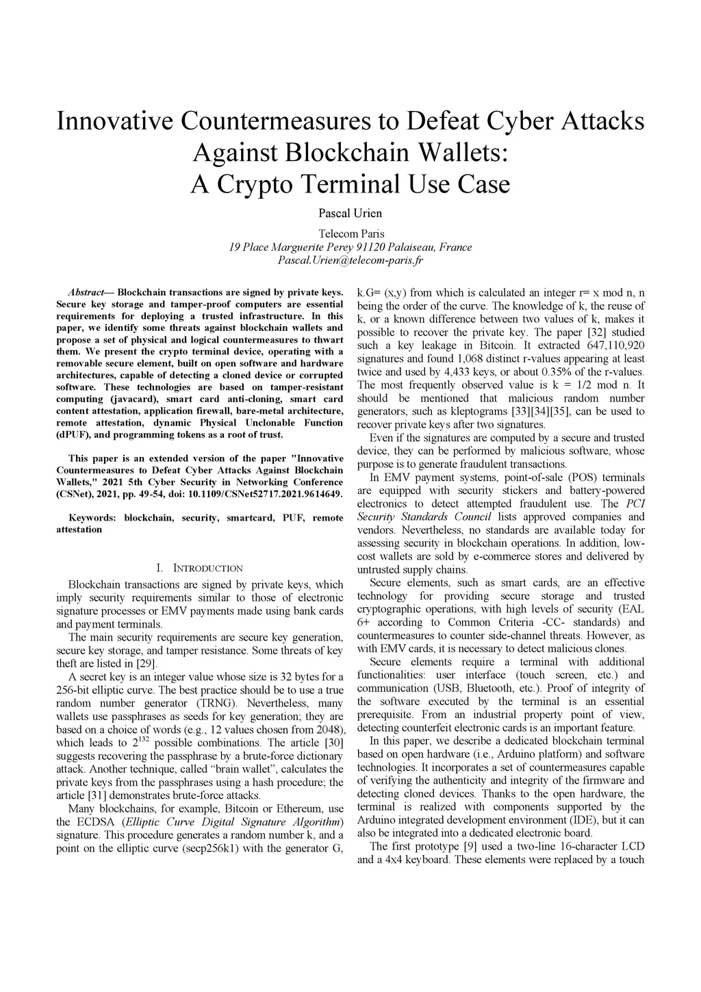 Blockchain transactions are signed by private keys. Secure key storage and tamper-proof computers are essential requirements for deploying a trusted infrastructure. In this paper, we identify some threats against blockchain wallets and propose a set of physical and logical countermeasures to thwart them. We present the crypto terminal device, operating with a removable secure element, built on open software and hardware architectures, capable of detecting a cloned device or corrupted software. These technologies are based on tamper-resistant computing (javacard), smart card anti-cloning, smart card content attestation, application firewall, bare-metal architecture, remote attestation, dynamic Physical Unclonable Function (dPUF), and programming tokens as a root of trust.This paper is an extended version of the paper 'Ínnovative Countermeasures to Defeat Cyber Attacks Against Blockchain Wallets,'' 2021 5th Cyber Security in Networking Conference (CSNet), 2021, pp. 49-54, doi: 10.1109/CSNet52717.2021.9614649