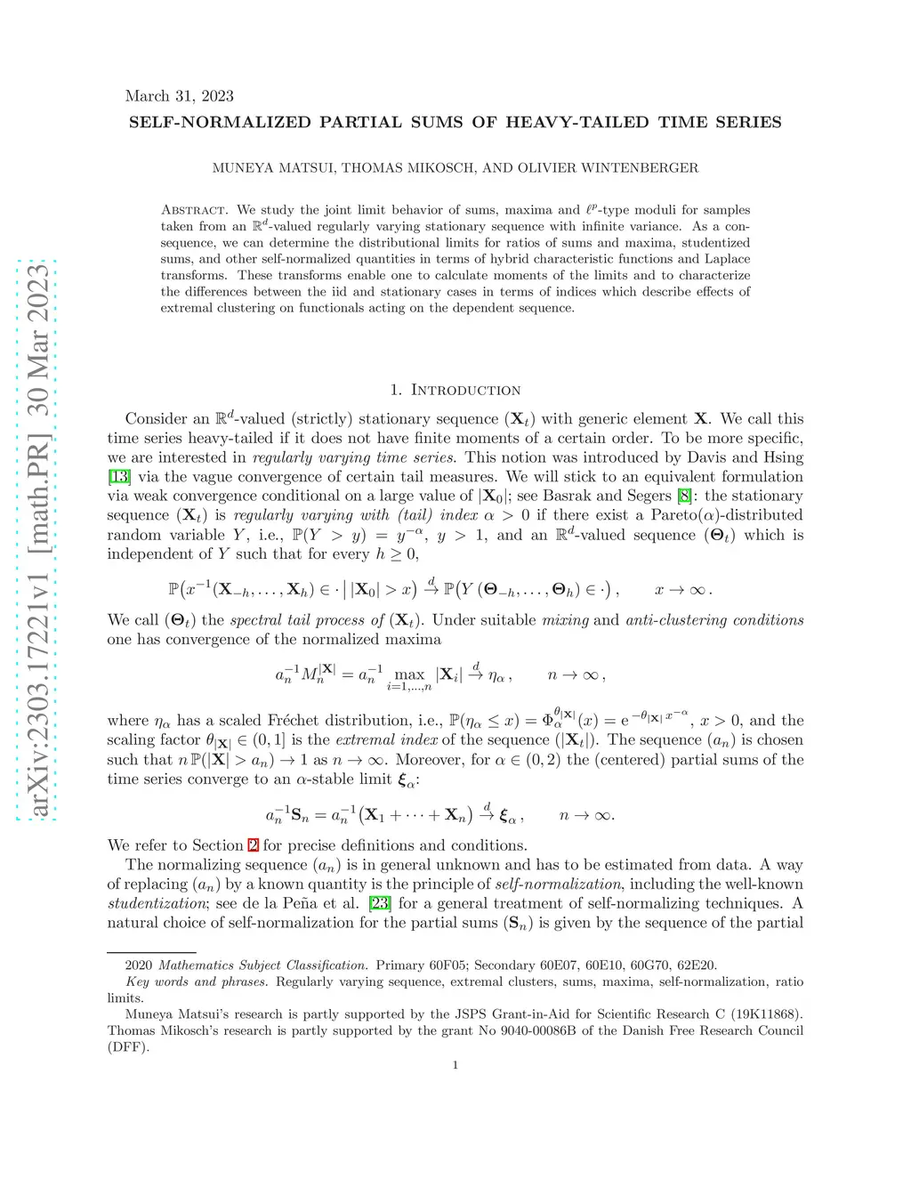 We study the joint limit behavior of sums, maxima and -type moduli for samples taken from an -valued regularly varying stationary sequence with infinite variance. As a consequence, we can determine the distributional limits for ratios of sums and maxima, studentized sums, and other self-normalized quantities in terms of hybrid characteristic functions and Laplace transforms. These transforms enable one to calculate moments of the limits and to characterize the differences between the iid and stationary cases in terms of indices which describe effects of extremal clustering on functionals acting on the dependent sequence.