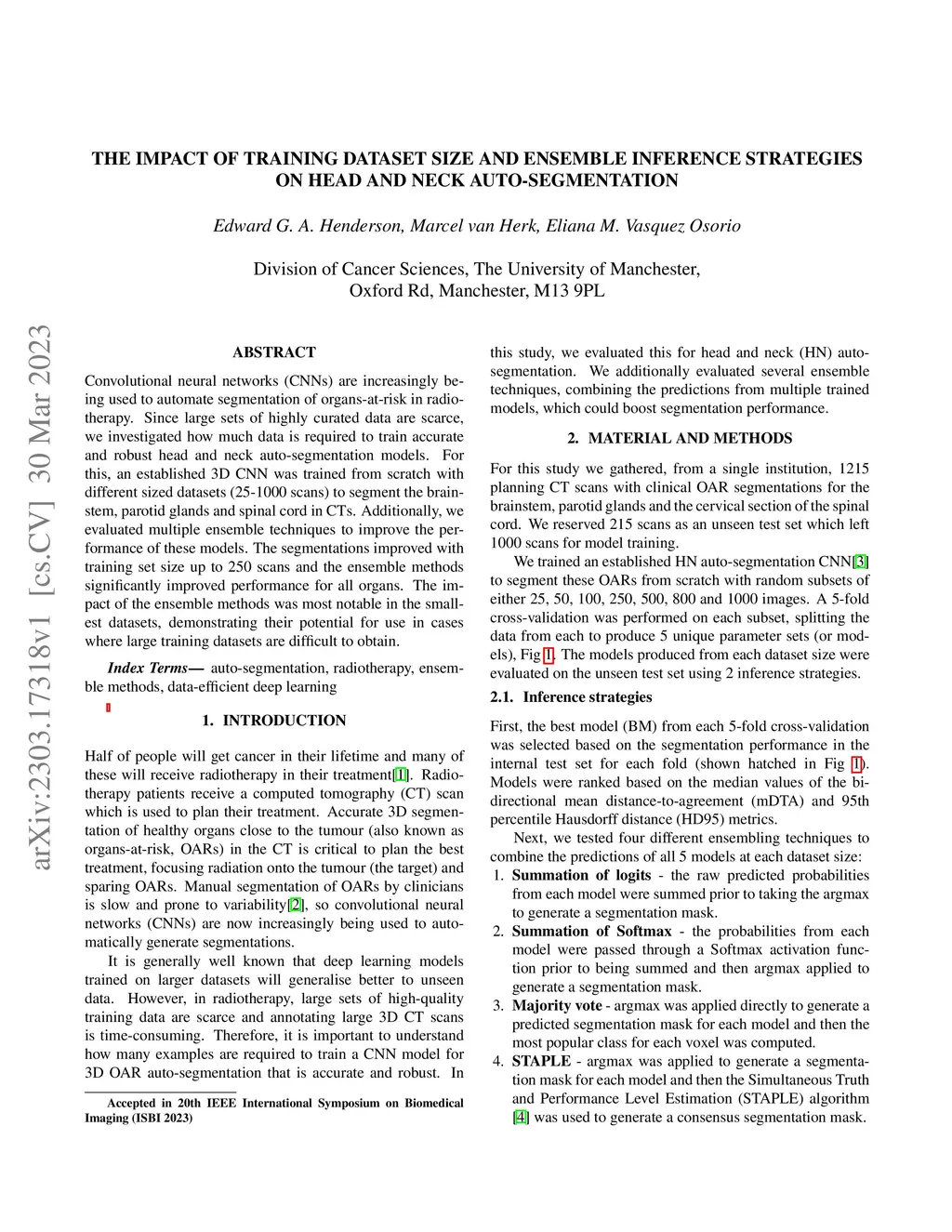 Convolutional neural networks (CNNs) are increasingly being used to automate segmentation of organs-at-risk in radiotherapy. Since large sets of highly curated data are scarce, we investigated how much data is required to train accurate and robust head and neck auto-segmentation models. For this, an established 3D CNN was trained from scratch with different sized datasets (25-1000 scans) to segment the brainstem, parotid glands and spinal cord in CTs. Additionally, we evaluated multiple ensemble techniques to improve the performance of these models. The segmentations improved with training set size up to 250 scans and the ensemble methods significantly improved performance for all organs. The impact of the ensemble methods was most notable in the smallest datasets, demonstrating their potential for use in cases where large training datasets are difficult to obtain.