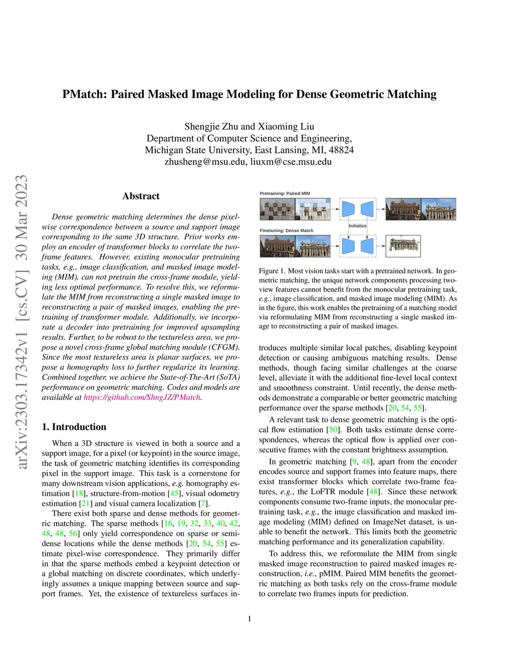 Dense geometric matching determines the dense pixel-wise correspondence between a source and support image corresponding to the same 3D structure. Prior works employ an encoder of transformer blocks to correlate the two-frame features. However, existing monocular pretraining tasks, e.g., image classification, and masked image modeling (MIM), can not pretrain the cross-frame module, yielding less optimal performance. To resolve this, we reformulate the MIM from reconstructing a single masked image to reconstructing a pair of masked images, enabling the pretraining of transformer module. Additionally, we incorporate a decoder into pretraining for improved upsampling results. Further, to be robust to the textureless area, we propose a novel cross-frame global matching module (CFGM). Since the most textureless area is planar surfaces, we propose a homography loss to further regularize its learning. Combined together, we achieve the State-of-The-Art (SoTA) performance on geometric matching. Codes and models are available at https://github.com/ShngJZ/PMatch.