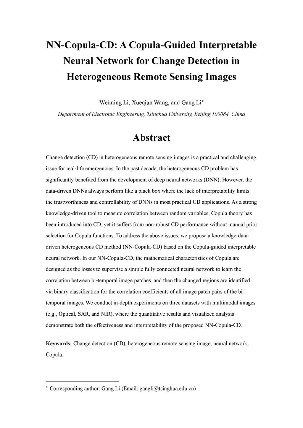 Change detection (CD) in heterogeneous remote sensing images is a practical and challenging issue for real-life emergencies. In the past decade, the heterogeneous CD problem has significantly benefited from the development of deep neural networks (DNN). However, the data-driven DNNs always perform like a black box where the lack of interpretability limits the trustworthiness and controllability of DNNs in most practical CD applications. As a strong knowledge-driven tool to measure correlation between random variables, Copula theory has been introduced into CD, yet it suffers from non-robust CD performance without manual prior selection for Copula functions. To address the above issues, we propose a knowledge-data-driven heterogeneous CD method (NN-Copula-CD) based on the Copula-guided interpretable neural network. In our NN-Copula-CD, the mathematical characteristics of Copula are designed as the losses to supervise a simple fully connected neural network to learn the correlation between bi-temporal image patches, and then the changed regions are identified via binary classification for the correlation coefficients of all image patch pairs of the bi-temporal images. We conduct in-depth experiments on three datasets with multimodal images (e.g., Optical, SAR, and NIR), where the quantitative results and visualized analysis demonstrate both the effectiveness and interpretability of the proposed NN-Copula-CD.