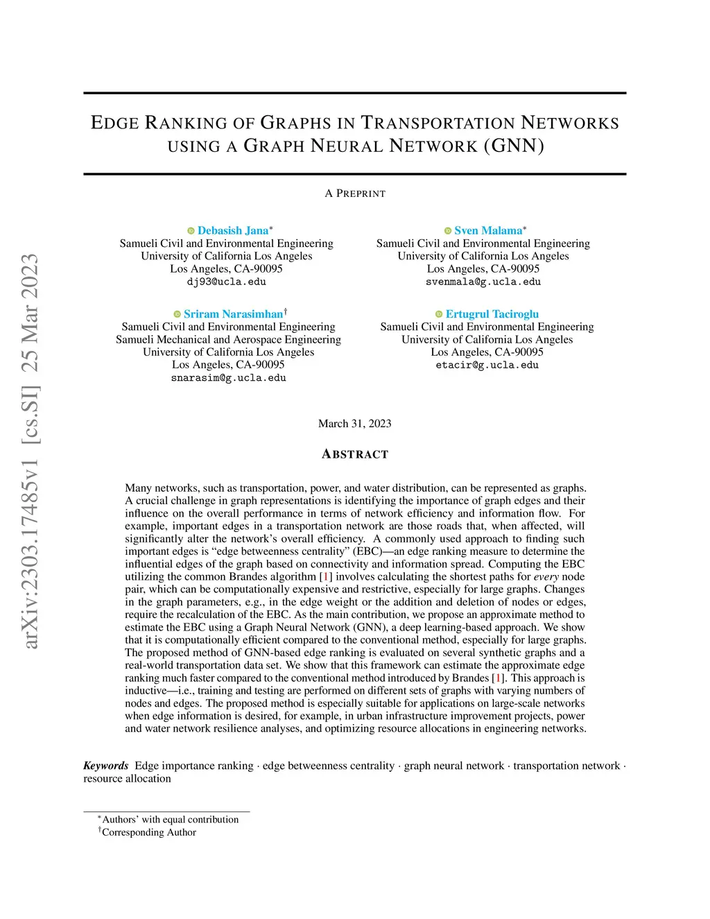 Edge Ranking of Graphs in Transportation Networks using a Graph Neural