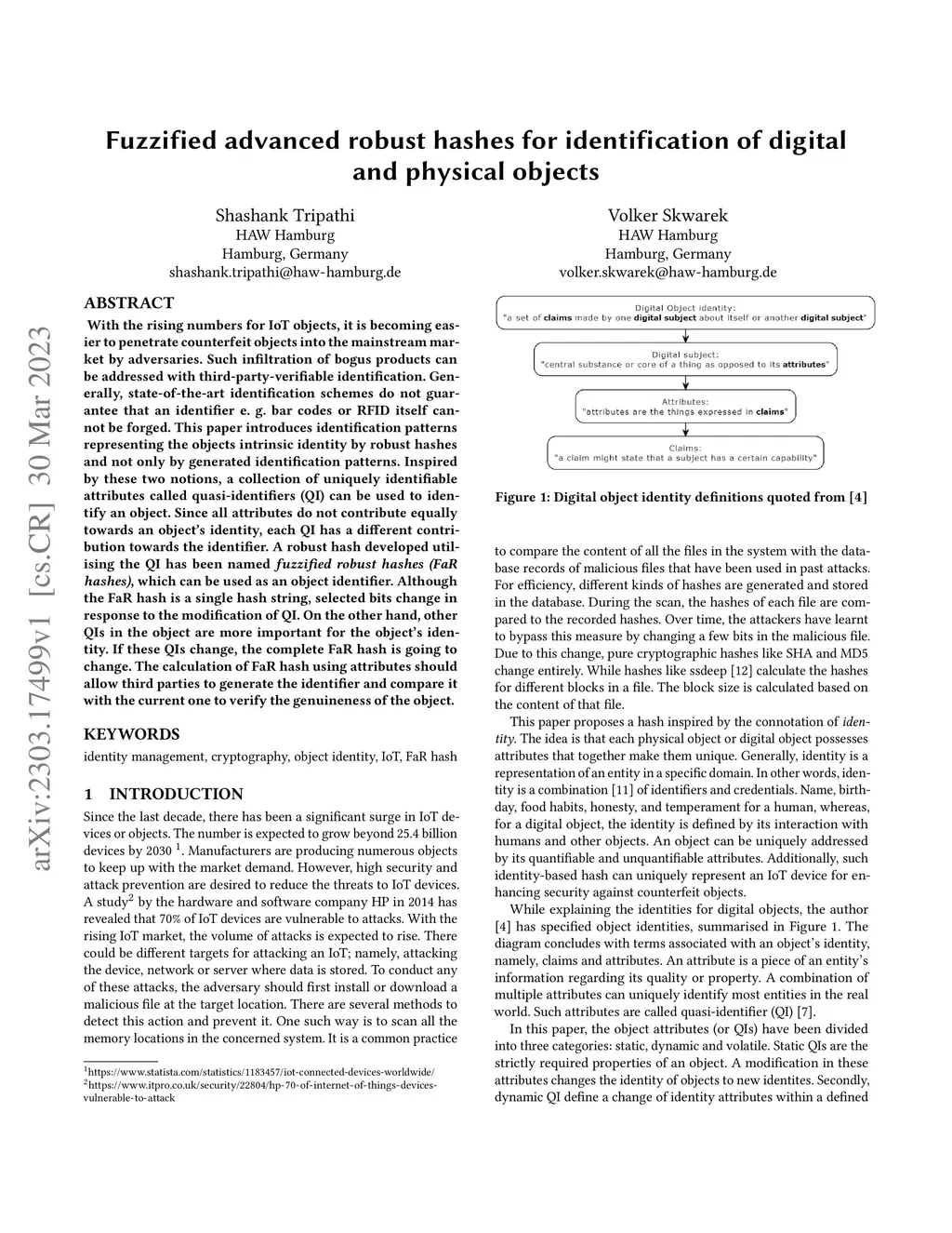 With the rising numbers for IoT objects, it is becoming easier to penetrate counterfeit objects into the mainstream market by adversaries. Such infiltration of bogus products can be addressed with third-party-verifiable identification. Generally, state-of-the-art identification schemes do not guarantee that an identifier e.g. barcodes or RFID itself cannot be forged. This paper introduces identification patterns representing the objects intrinsic identity by robust hashes and not only by generated identification patterns. Inspired by these two notions, a collection of uniquely identifiable attributes called quasi-identifiers (QI) can be used to identify an object. Since all attributes do not contribute equally towards an object's identity, each QI has a different contribution towards the identifier. A robust hash developed utilising the QI has been named fuzzified robust hashes (FaR hashes), which can be used as an object identifier. Although the FaR hash is a single hash string, selected bits change in response to the modification of QI. On the other hand, other QIs in the object are more important for the object's identity. If these QIs change, the complete FaR hash is going to change. The calculation of FaR hash using attributes should allow third parties to generate the identifier and compare it with the current one to verify the genuineness of the object.