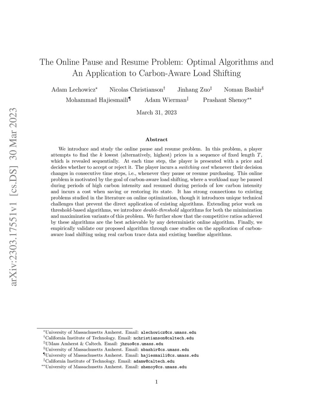 We introduce and study the online pause and resume problem. In this problem, a player attempts to find the lowest (alternatively, highest) prices in a sequence of fixed length , which is revealed sequentially. At each time step, the player is presented with a price and decides whether to accept or reject it. The player incurs a switching cost whenever their decision changes in consecutive time steps, i.e., whenever they pause or resume purchasing. This online problem is motivated by the goal of carbon-aware load shifting, where a workload may be paused during periods of high carbon intensity and resumed during periods of low carbon intensity and incurs a cost when saving or restoring its state. It has strong connections to existing problems studied in the literature on online optimization, though it introduces unique technical challenges that prevent the direct application of existing algorithms. Extending prior work on threshold-based algorithms, we introduce double-threshold algorithms for both the minimization and maximization variants of this problem. We further show that the competitive ratios achieved by these algorithms are the best achievable by any deterministic online algorithm. Finally, we empirically validate our proposed algorithm through case studies on the application of carbon-aware load shifting using real carbon trace data and existing baseline algorithms.