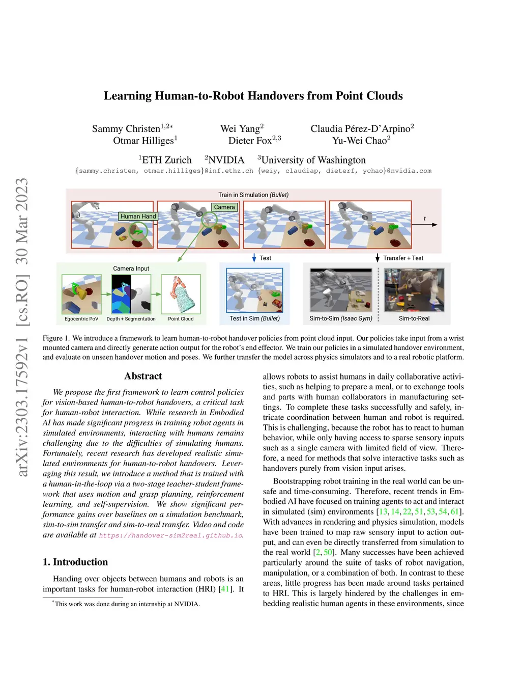 We propose the first framework to learn control policies for vision-based human-to-robot handovers, a critical task for human-robot interaction. While research in Embodied AI has made significant progress in training robot agents in simulated environments, interacting with humans remains challenging due to the difficulties of simulating humans. Fortunately, recent research has developed realistic simulated environments for human-to-robot handovers. Leveraging this result, we introduce a method that is trained with a human-in-the-loop via a two-stage teacher-student framework that uses motion and grasp planning, reinforcement learning, and self-supervision. We show significant performance gains over baselines on a simulation benchmark, sim-to-sim transfer and sim-to-real transfer.